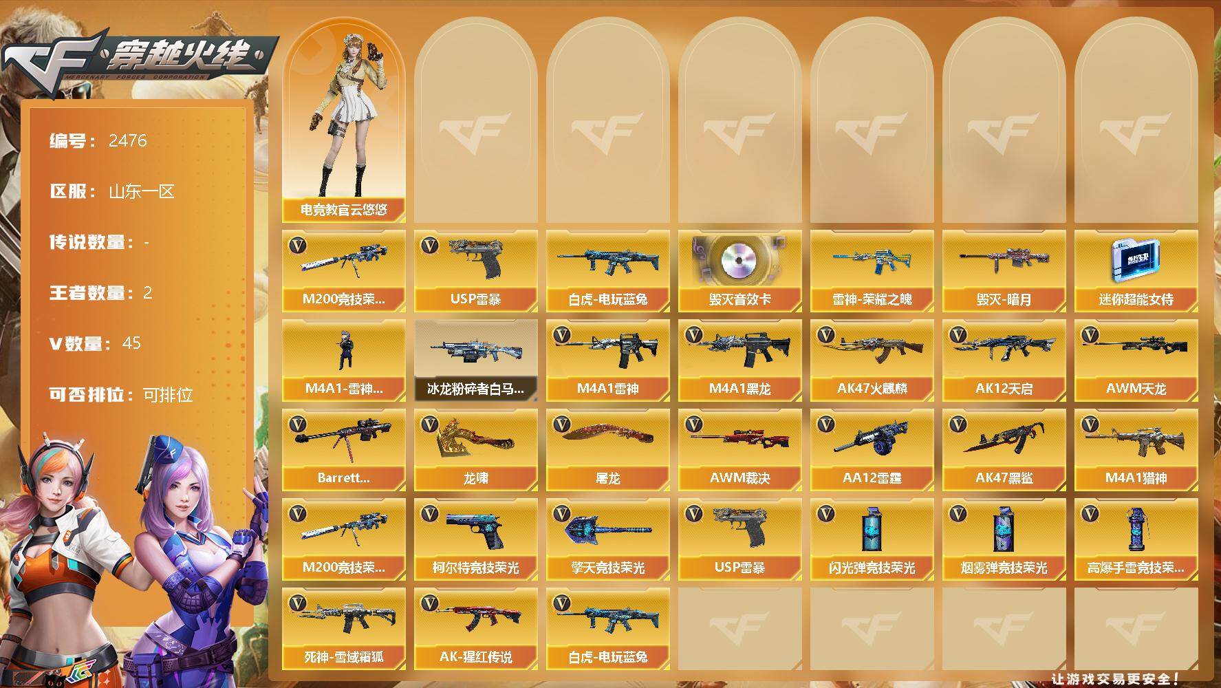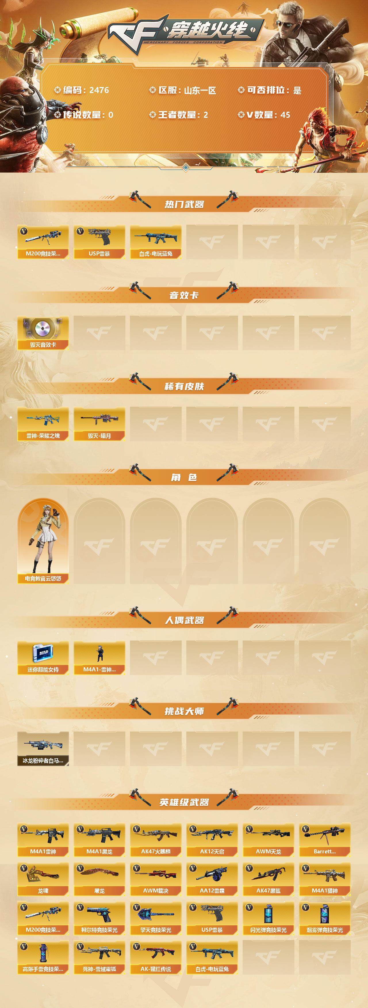 [12119026]【商品标题】:山东一区-45V-2王者-0炫金 【热门武器】:M200-竞技荣光,白虎-电玩蓝兔,USP-雷暴 【音效卡】:Barrett-毁灭音效卡 【稀有皮肤】:雷神-荣耀之魄,毁灭-暗月 【角色】:电竞教官-云悠悠 【人偶武器】:M4A1-雷神-精英刀锋,迷你超能女侍 【挑战大师】:冰龙粉碎者-白马银枪 【英雄级武器】:M200-竞技荣光,柯尔特-竞技荣光,擎天-竞技荣光*2,高爆手雷-竞技荣光*7,烟雾弹-竞技荣光*7,闪光弹-竞技荣光*7,USP-雷暴,白虎-电玩蓝兔,M4A1-雷神,M4A1-黑龙*2,AK47-火麒麟,AK12-天启,AWM-天龙,Barrett-毁灭,AWM-裁决,AA-12-雷霆,AK47-黑鲨,M4A1-猎神,死神-雪域霜狐,AK-47-猩红传说,龙啸,屠龙 【特殊枪械】: