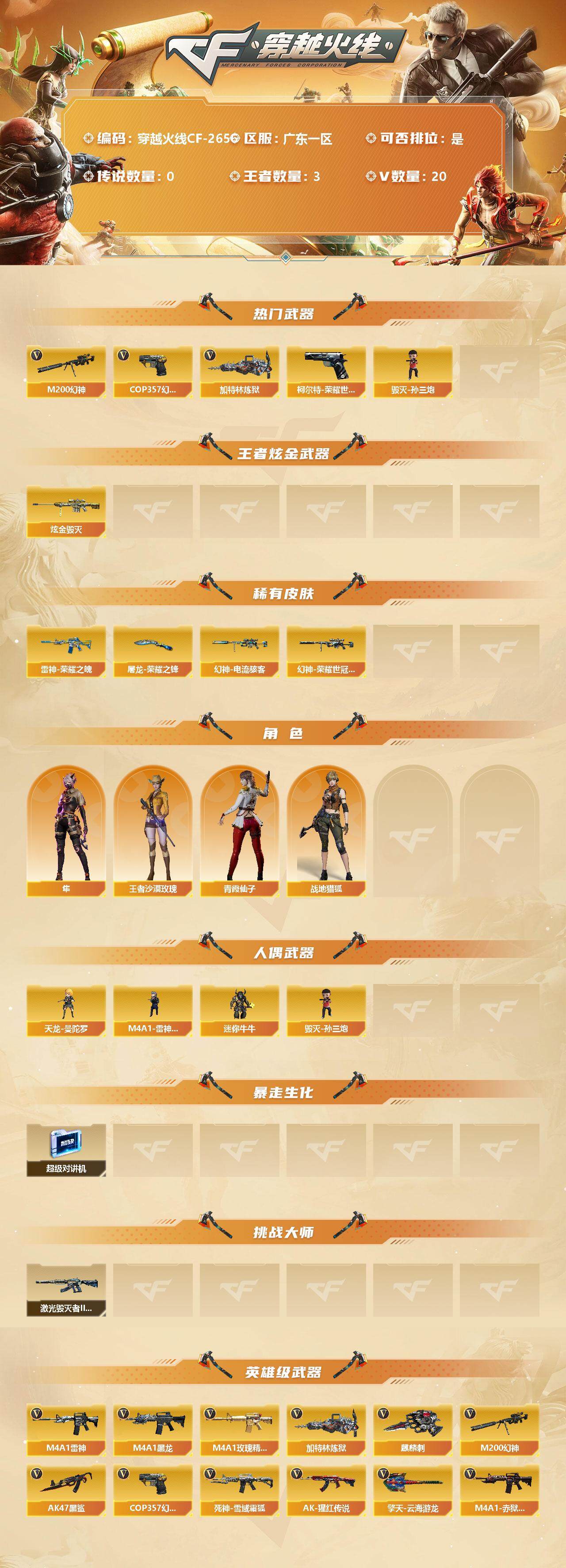 [12128936]【商品标题】:广东一区-20V-3王者-1炫金 【热门武器】:M200-幻神,柯尔特-荣耀世冠白鲨2023,加特林-炼狱,毁灭-孙三炮,COP 357-幻灵 【王者炫金武器】:炫金毁灭 【稀有皮肤】:幻神-电流骇客 皮肤,幻神-荣耀世冠白鲨2023 皮肤,雷神-荣耀之魄,屠龙-荣耀之锋 【角色】:王者沙漠玫瑰,隼,战地猎狐,青霞仙子 【人偶武器】:毁灭-孙三炮,天龙-曼陀罗,M4A1-雷神-精英刀锋,迷你牛牛 【暴走生化】:超级对讲机 【挑战大师】:激光毁灭者III-白马银枪 【英雄级武器】:COP 357-幻灵,M4A1-雷神,M4A1-黑龙,M4A1-玫瑰精灵,加特林-炼狱,M200-幻神,AK47-黑鲨,死神-雪域霜狐,AK-47-猩红传说,M4A1-赤狱骑士,麒麟刺,擎天-云海游龙 【特殊枪械】:1炼狱