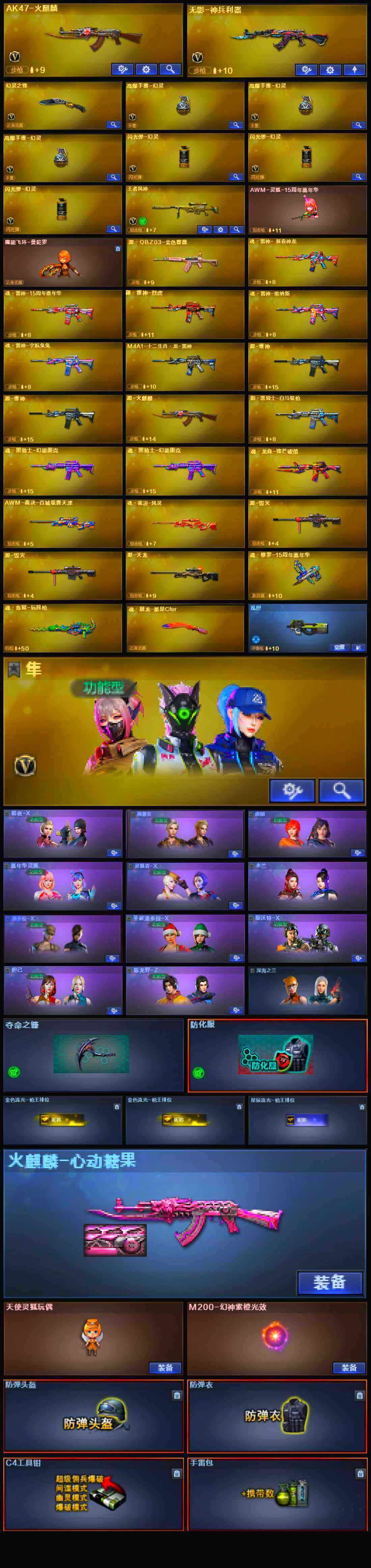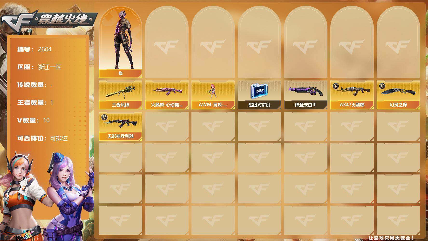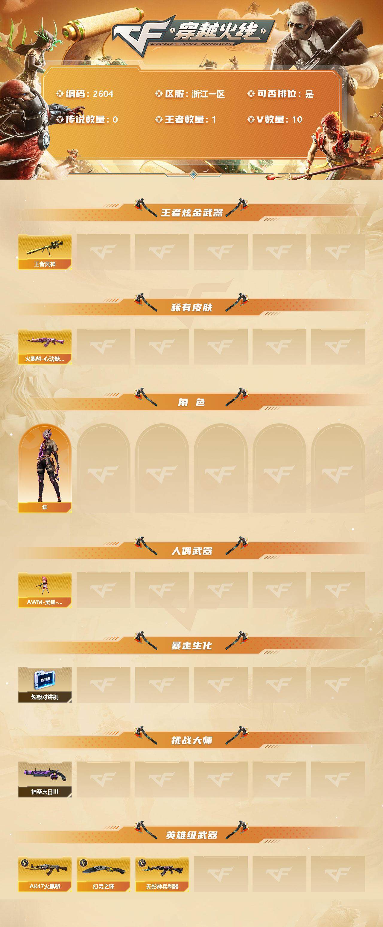 [12151386]【商品标题】:浙江一区-10V-1王者-0炫金 【王者炫金武器】:王者风神 【稀有皮肤】:火麒麟-心动糖果 【角色】:隼 【人偶武器】:AWM-灵狐-15周年嘉年华 【暴走生化】:超级对讲机 【挑战大师】:神圣爆裂者-末日III 【英雄级武器】:幻灵之锋,无影-神兵利器,AK47-火麒麟 【特殊枪械】: