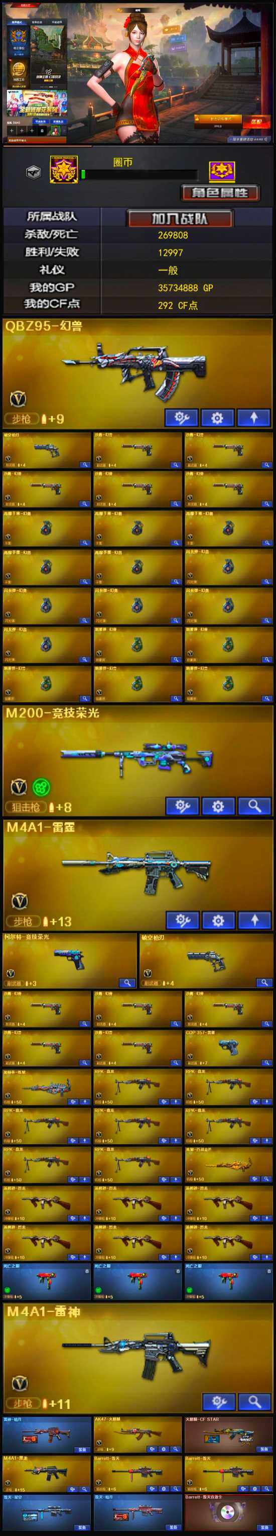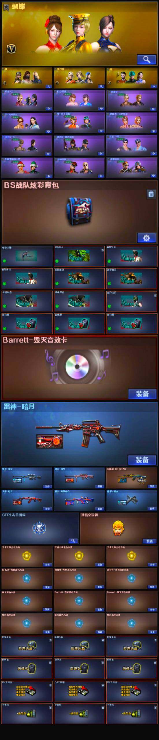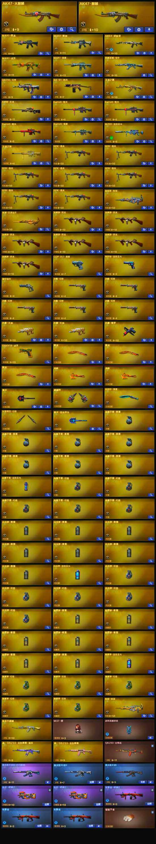 【英雄级武器】:M200-竞技荣光,柯尔特-竞技荣光,擎天-竞技荣光,高爆手雷-竞技荣光,烟雾弹-竞技荣光,闪光弹-竞技荣光,M4A1-雷霆,QBZ95-幻兽,沙鹰-幻兽*5,女皇利刃-幻兽,M4A1-武圣,Glock18-武圣,M4A1-雷神,M4A1-黑龙,RPK-盘龙*7,加特林-炼狱,汤姆逊-烈龙*6,AK47-麒麟,AK47-火麒麟,AN94-超新星,AWM-天龙,Barrett-毁灭*2,Barrett-极光,沙鹰-天神*2,沙鹰-修罗,麒麟刺,擎天,龙啸*2,屠龙*3,高爆手雷-幻兽*5
