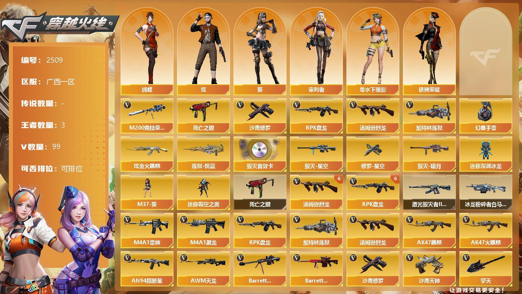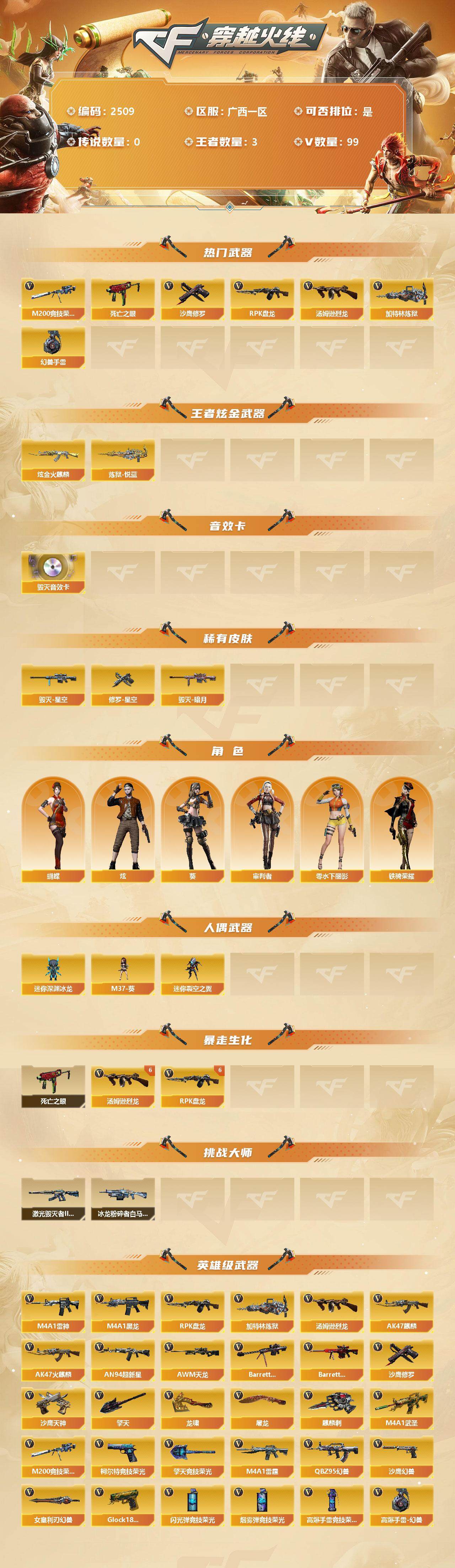 [12153146]【商品标题】:广西一区-99V-3王者-1炫金 【热门武器】:M200-竞技荣光,死亡之眼*3,汤姆逊-烈龙*6,RPK-盘龙*7,加特林-炼狱,沙鹰-修罗,高爆手雷-幻兽*5 【王者炫金武器】:炫金火麒麟,炼狱-悦蓝 【音效卡】:Barrett-毁灭音效卡 【稀有皮肤】:毁灭-暗月,毁灭-星空,修罗-星空 【角色】:零-水下丽影,审判者,葵,蝴蝶,炫,铁骑荣耀 【人偶武器】:M37-葵,迷你深渊冰龙,迷你裂空之翼 【暴走生化】:死亡之眼*3 【挑战大师】:激光毁灭者III-白马银枪,冰龙粉碎者-白马银枪 【英雄级武器】:M200-竞技荣光,柯尔特-竞技荣光,擎天-竞技荣光,高爆手雷-竞技荣光,烟雾弹-竞技荣光,闪光弹-竞技荣光,M4A1-雷霆,QBZ95-幻兽,沙鹰-幻兽*5,女皇利刃-幻兽,M4A1-武圣,Glock18-武圣,M4A1-雷神,M4A1-黑龙,RPK-盘龙*7,加特林-炼狱,汤姆逊-烈龙*6,AK47-麒麟,AK47-火麒麟,AN94-超新星,AWM-天龙,Barrett-毁灭*2,Barrett-极光,沙鹰-天神*2,沙鹰-修罗,麒麟刺,擎天,龙啸*2,屠龙*3,高爆手雷-幻兽*5 【特殊枪械】:6烈龙,6盘龙,1炼狱