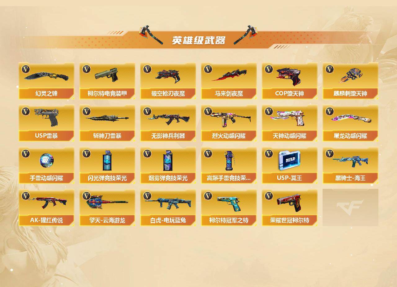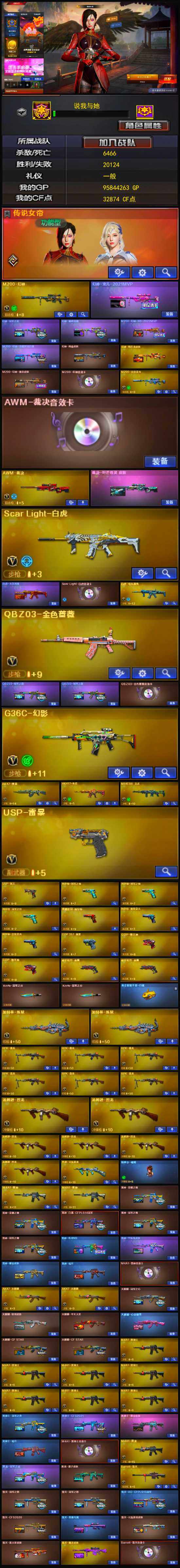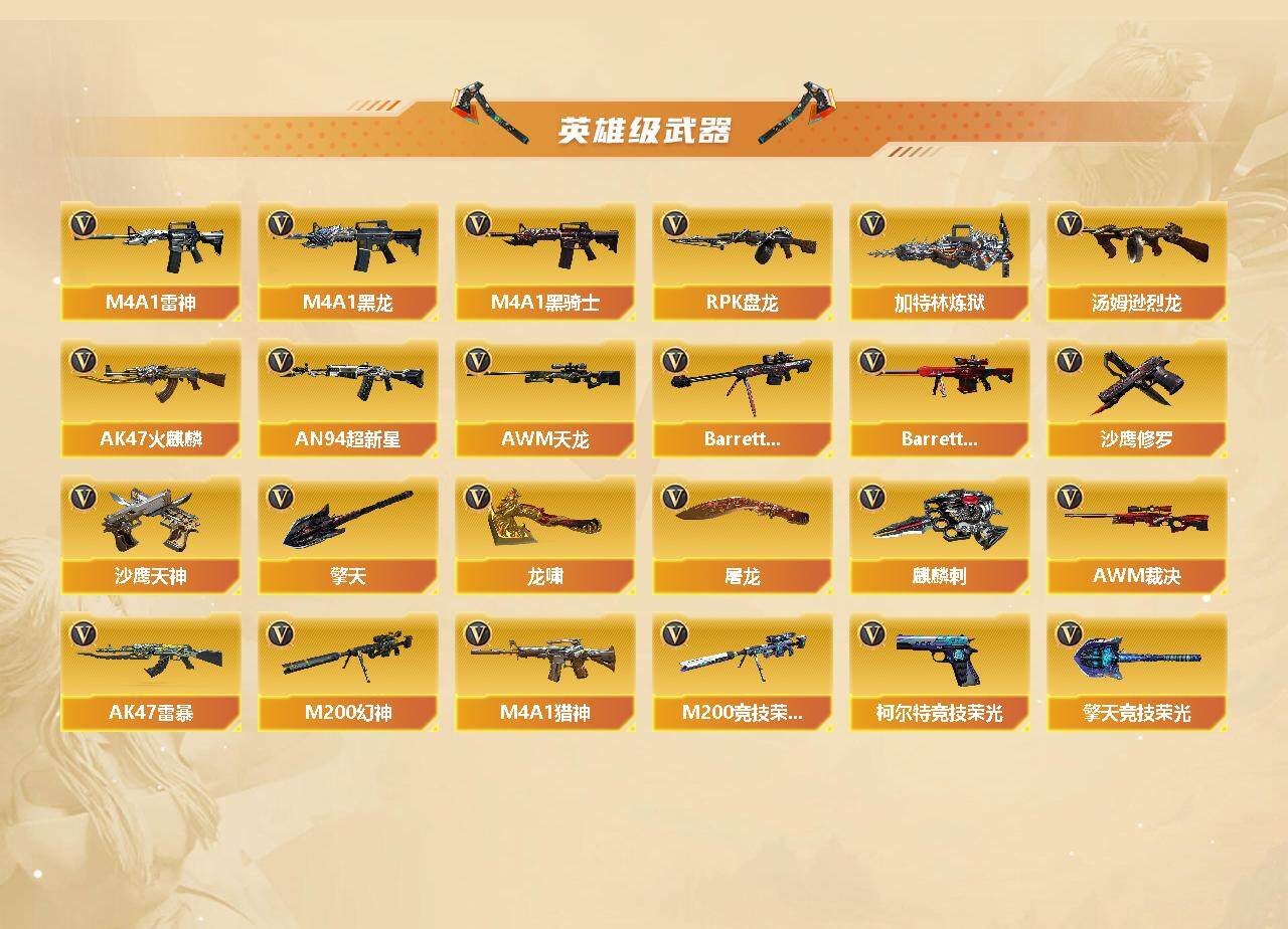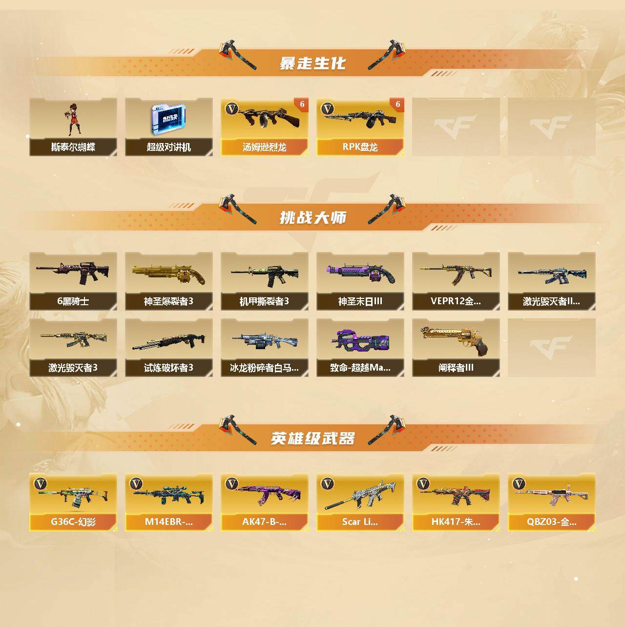 【热门武器】:G36C-幻影,QBZ03-金色蔷薇,M14EBR-玄武,Scar Light-白虎,HK417-朱雀,M200-幻神,M200-竞技荣光,白虎-电玩蓝兔,柯尔特-冠军之特*3,荣耀世冠-柯尔特,M4A1-黑骑士*7,汤姆逊-烈龙*6,RPK-盘龙*6,加特林-炼狱*2,斯泰尔-蝴蝶,羊驼玩偶,USP-雷暴,COP-堕天神*2,沙鹰-修罗*2,Knife-冠军之刃*2,黄金猫猫手套-白鲨,金刚伞