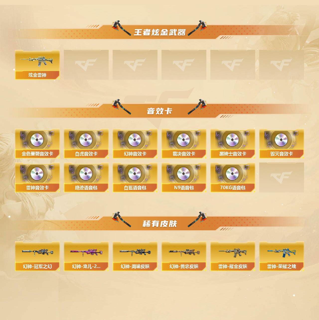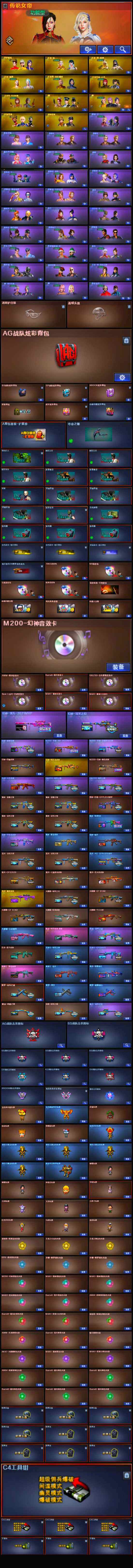 【音效卡】:M200-幻神音效卡,M4A1-雷神音效卡,M4A1-黑骑士音效卡,Barrett-毁灭音效卡,QBZ03-金色蔷薇音效卡,AWM-裁决音效卡,Scar Light-白虎音效卡,70KG语音包,绝迹语音包,白鲨语音包,N9语音包