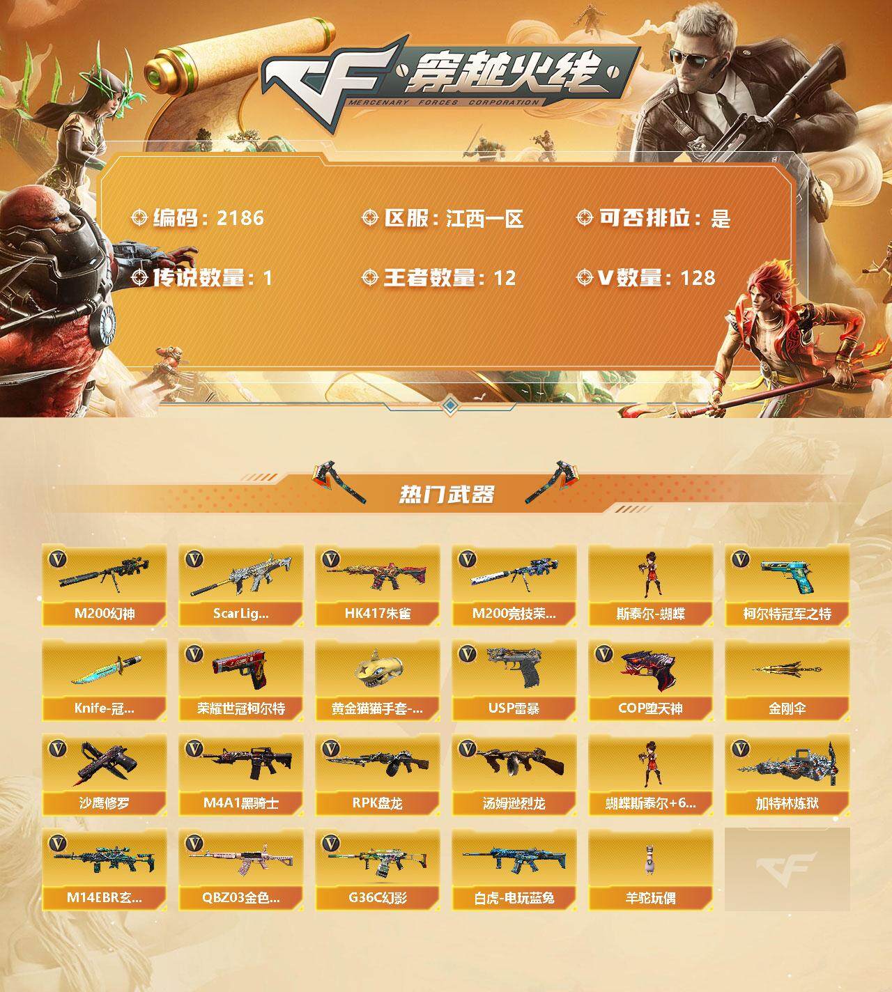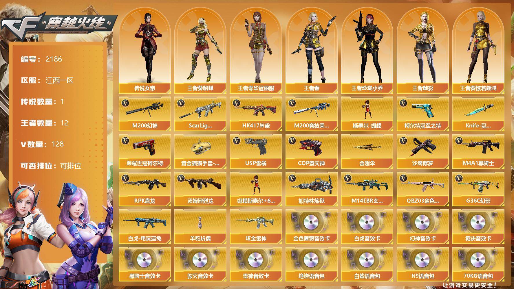 [11872934]【商品标题】:江西一区-128V-12王者-1炫金 【传说角色】:传说女帝 【热门武器】:G36C-幻影,QBZ03-金色蔷薇,M14EBR-玄武,Scar Light-白虎,HK417-朱雀,M200-幻神,M200-竞技荣光,白虎-电玩蓝兔,柯尔特-冠军之特*3,荣耀世冠-柯尔特,M4A1-黑骑士*7,汤姆逊-烈龙*6,RPK-盘龙*6,加特林-炼狱*2,斯泰尔-蝴蝶,羊驼玩偶,USP-雷暴,COP-堕天神*2,沙鹰-修罗*2,Knife-冠军之刃*2,黄金猫猫手套-白鲨,金刚伞 【王者炫金武器】:炫金雷神 【音效卡】:M200-幻神音效卡,M4A1-雷神音效卡,M4A1-黑骑士音效卡,Barrett-毁灭音效卡,QBZ03-金色蔷薇音效卡,AWM-裁决音效卡,Scar Light-白虎音效卡,70KG语音包,绝迹语音包,白鲨语音包,N9语音包 【稀有皮肤】:M200-幻神-黄忠皮肤,幻神-周瑜皮肤,幻神-冠军之幻,幻神-宠儿-2021MVP,幻神-巅峰荣耀,M200-幻神-荣耀世冠白鲨,M200-幻神-N9-2022MVP,幻神-纸灯龙皮肤,白虎-大汉风骨,QBZ03-冠军之薇*2,雷神-荣耀之魄*2,雷神-耀金皮肤,雷神-冠军之魄*2,雷神-传奇N9,火麒麟-冠军之心,火麒麟-轻羽皮肤,火麒麟-平天大圣*2,火麒麟-心动糖果,黑骑士-暗月,黑骑士-冠军之势,黑骑士-CFS2021,黑龙-墨子皮肤,黑龙-冠军之武,毁灭-冠军之怒*2,毁灭-CFS2020,毁灭-黑大圣皮肤,M200-庆典-CFS 2021,AWM-CFS 2020,修罗-星空,修罗-冠军之魂,屠龙-荣耀之锋,擎天-冠军之击,龙啸-冠军之啸 【角色】:传说女帝,王者零-华冠丽服,王者-葵-貂蝉,王者葵-惊若翩鸿,王者春,王者-魅影,王者玲珑-小乔,樱,鹰,幽,蜀雪,铁骑荣耀,职业选手,青霞仙子,战地猎狐 【人偶武器】:斯泰尔-蝴蝶,白虎-迷你小艾,火麒麟-灵狐,黄金迷你深渊冰龙,迷你深渊冰龙,迷你艾比,迷你超能女侍,迷你巨石泰坦-魔花研究所,迷你裂空之翼,迷你牛魔王,黄金迷你裂空之翼,迷你波特博士,迷你曼提柯尔,夺魂,迷你牛牛,迷你火种,灵狐娃娃手雷,深渊终结者手雷,闪光弹-貂蝉,高爆手雷-大乔 【暴走生化】:斯泰尔-蝴蝶,超级对讲机 【挑战大师】:神圣爆裂者III,机甲撕裂者III,神圣爆裂