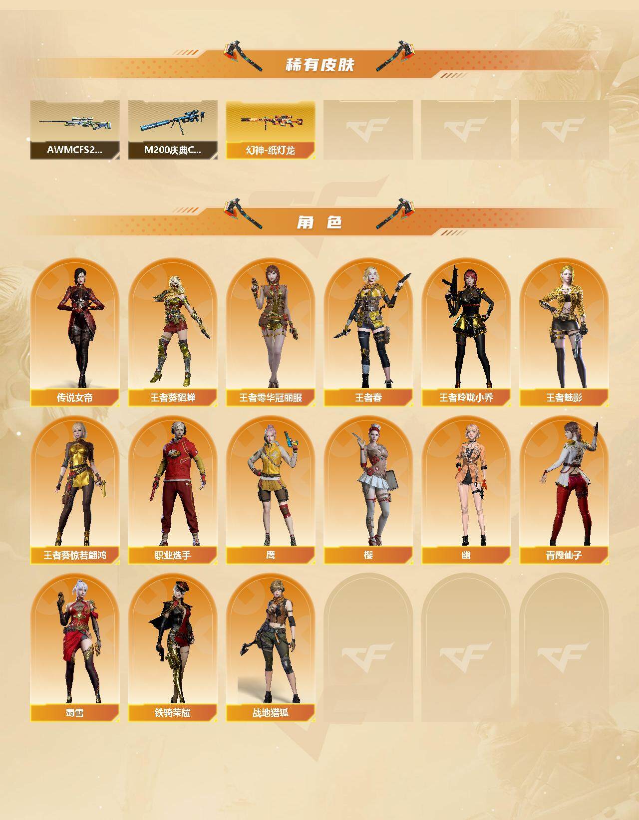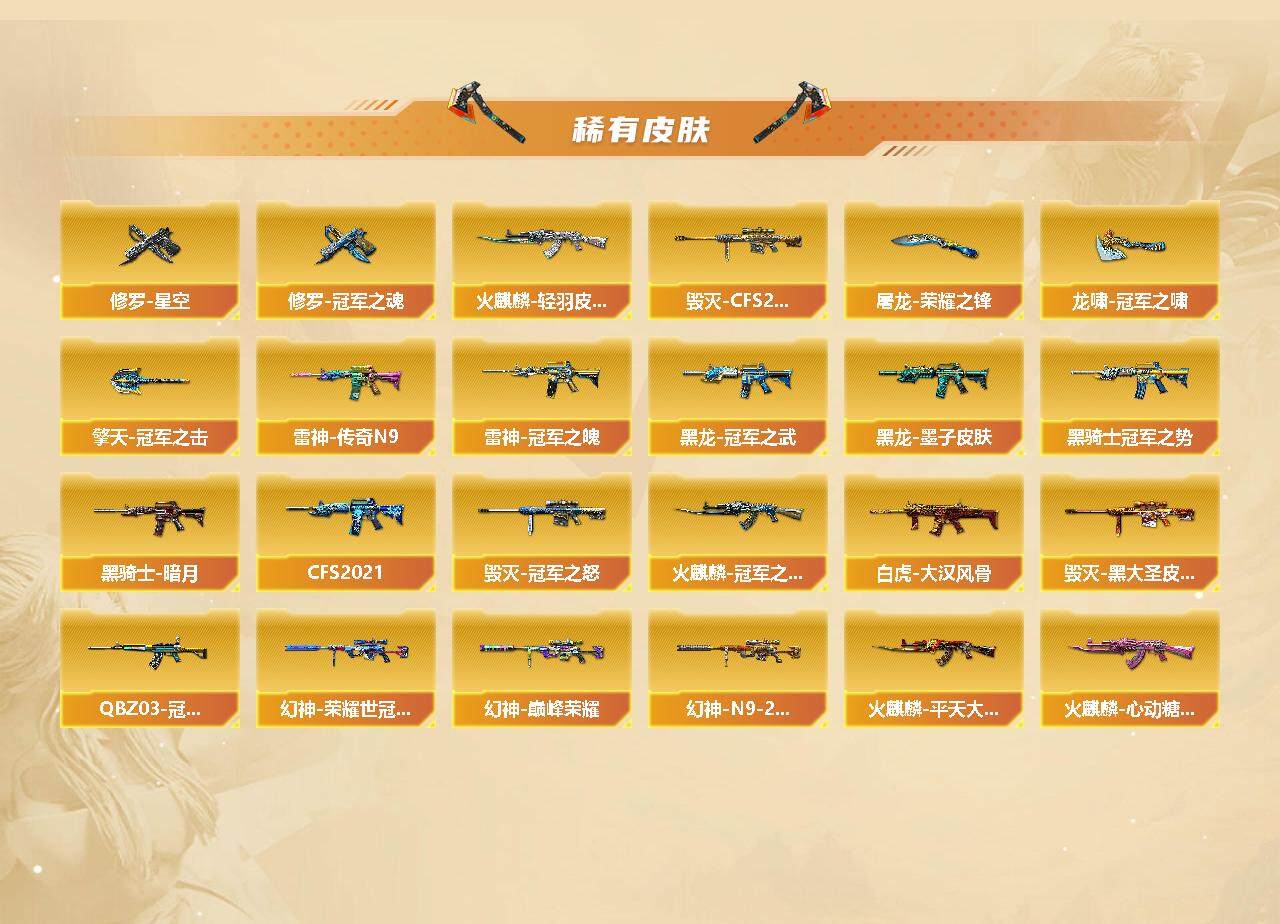 【稀有皮肤】:M200-幻神-黄忠皮肤,幻神-周瑜皮肤,幻神-冠军之幻,幻神-宠儿-2021MVP,幻神-巅峰荣耀,M200-幻神-荣耀世冠白鲨,M200-幻神-N9-2022MVP,幻神-纸灯龙皮肤,白虎-大汉风骨,QBZ03-冠军之薇*2,雷神-荣耀之魄*2,雷神-耀金皮肤,雷神-冠军之魄*2,雷神-传奇N9,火麒麟-冠军之心,火麒麟-轻羽皮肤,火麒麟-平天大圣*2,火麒麟-心动糖果,黑骑士-暗月,黑骑士-冠军之势,黑骑士-CFS2021,黑龙-墨子皮肤,黑龙-冠军之武,毁灭-冠军之怒*2,毁灭-CFS2020,毁灭-黑大圣皮肤,M200-庆典-CFS 2021,AWM-CFS 2020,修罗-星空,修罗-冠军之魂,屠龙-荣耀之锋,擎天-冠军之击,龙啸-冠军之啸