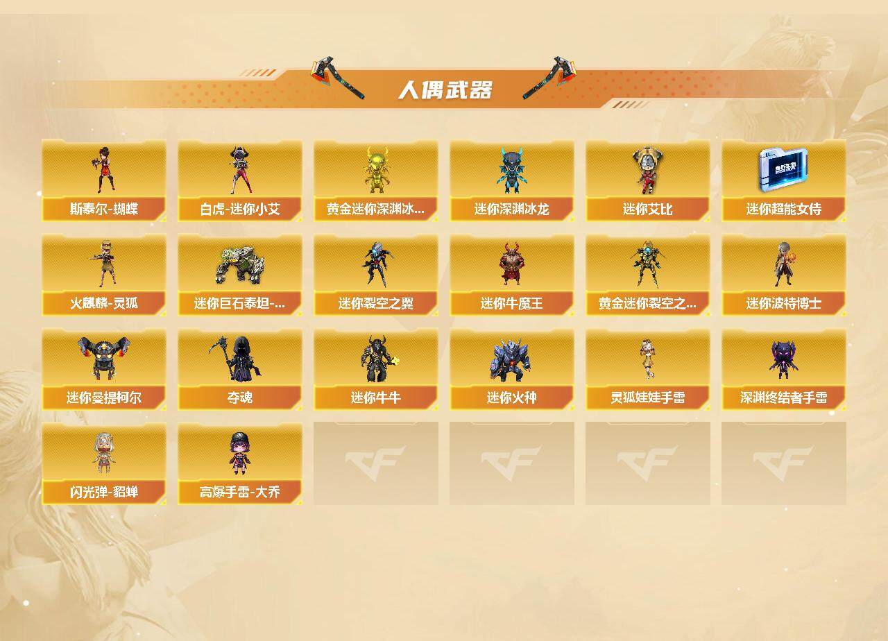 【人偶武器】:斯泰尔-蝴蝶,白虎-迷你小艾,火麒麟-灵狐,黄金迷你深渊冰龙,迷你深渊冰龙,迷你艾比,迷你超能女侍,迷你巨石泰坦-魔花研究所,迷你裂空之翼,迷你牛魔王,黄金迷你裂空之翼,迷你波特博士,迷你曼提柯尔,夺魂,迷你牛牛,迷你火种,灵狐娃娃手雷,深渊终结者手雷,闪光弹-貂蝉,高爆手雷-大乔