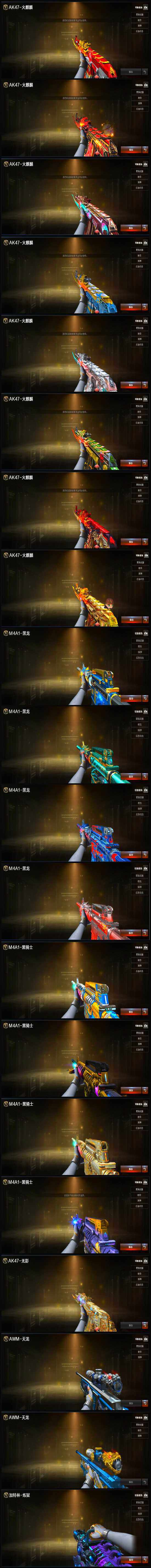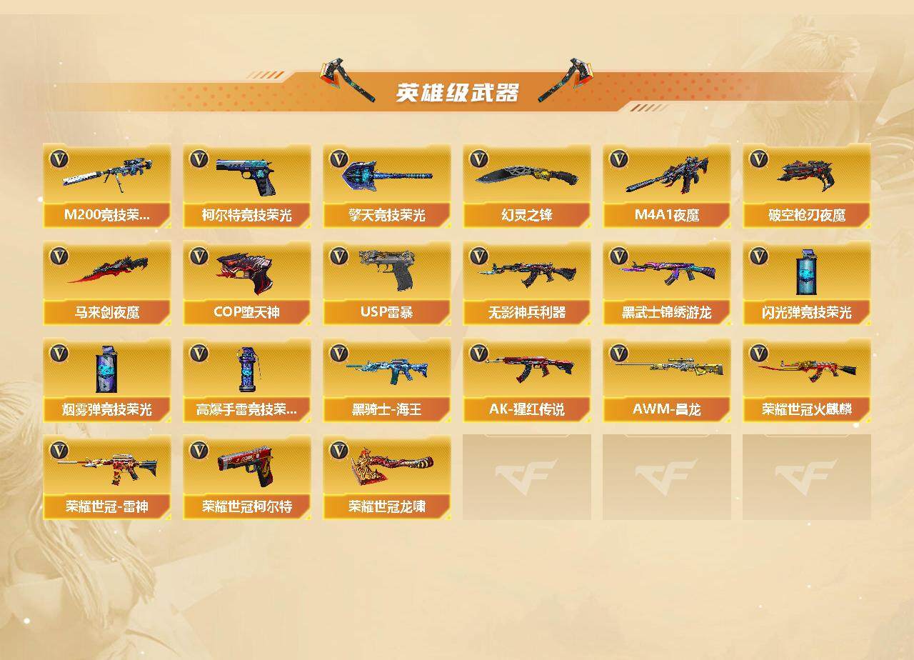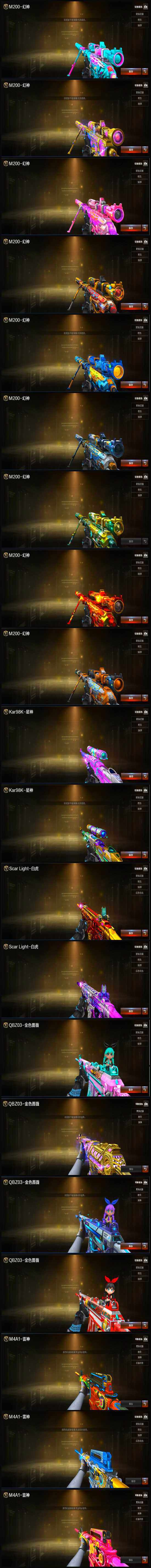 【热门武器】:传说梦魇,传说幽瞳,传说幽冥,QBZ03-金色蔷薇*4,Scar Light-白虎,HK417-朱雀*2,M200-幻神,修罗-古蛇迷踪,M200-竞技荣光*2,荣耀世冠-火麒麟,荣耀世冠-雷神*2,荣耀世冠-柯尔特*6,Kar98K-星神,金色小号,C.A.T,Cat-刀锋,炼狱-迷你小钢,牛牛-AK47*2,M4A1-黑骑士*3,汤姆逊-烈龙*6,RPK-盘龙*4,加特林-炼狱*4,斯泰尔-蝴蝶,王者M4A1-萌萌金发刀锋,毁灭-孙三炮,裁决-雪莉杨,COP-白鲨,USP-雷暴,COP-堕天神,沙鹰-修罗*2,Knife-冠军之刃*2,炽芒蝶刃*3,荣耀世冠-龙啸,金刚伞*9