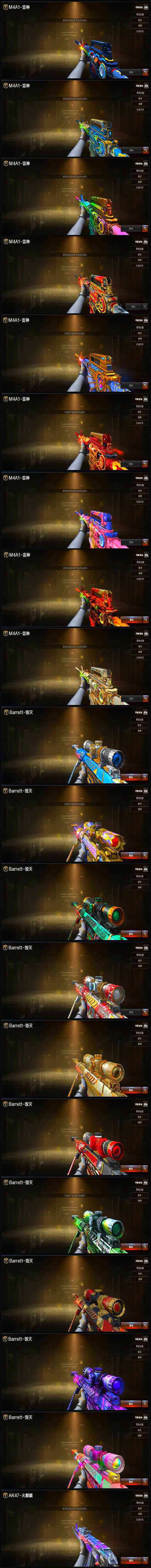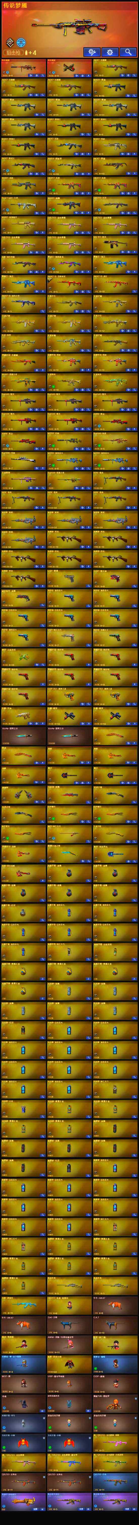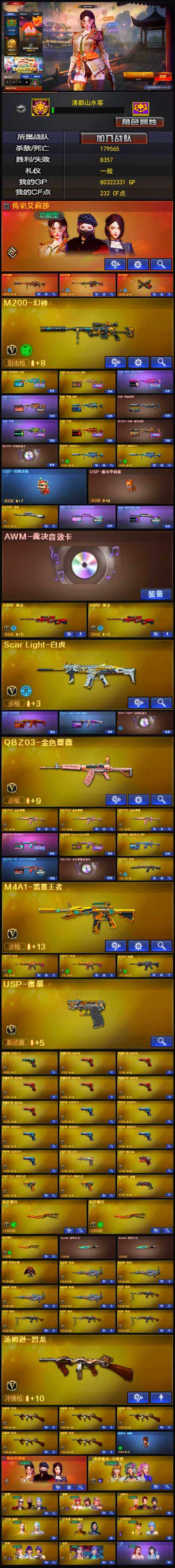 【热门武器】:传说梦魇,传说幽瞳,传说幽冥,QBZ03-金色蔷薇*4,Scar Light-白虎,HK417-朱雀*2,M200-幻神,修罗-古蛇迷踪,M200-竞技荣光*2,荣耀世冠-火麒麟,荣耀世冠-雷神*2,荣耀世冠-柯尔特*6,Kar98K-星神,金色小号,C.A.T,Cat-刀锋,炼狱-迷你小钢,牛牛-AK47*2,M4A1-黑骑士*3,汤姆逊-烈龙*6,RPK-盘龙*4,加特林-炼狱*4,斯泰尔-蝴蝶,王者M4A1-萌萌金发刀锋,毁灭-孙三炮,裁决-雪莉杨,COP-白鲨,USP-雷暴,COP-堕天神,沙鹰-修罗*2,Knife-冠军之刃*2,炽芒蝶刃*3,荣耀世冠-龙啸,金刚伞*9