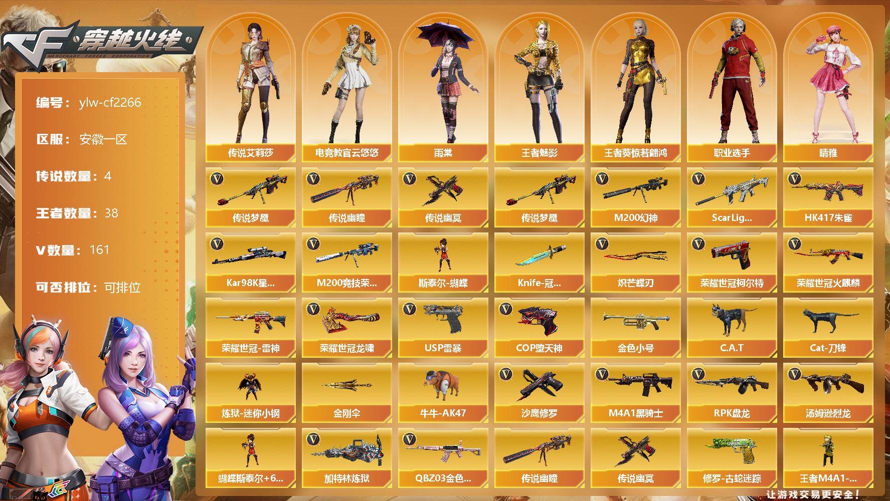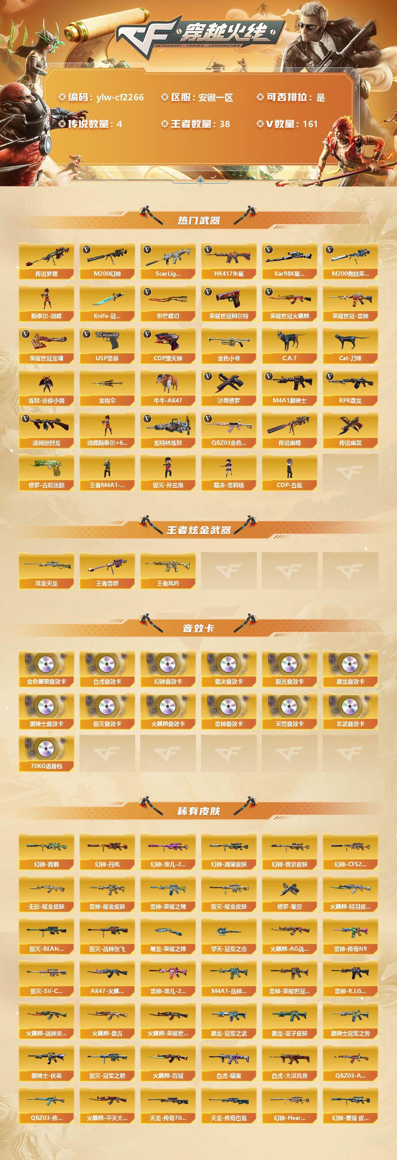 [12032289]【商品标题】:安徽一区-161V-38王者-2炫金 【传说武器】:传说梦魇,传说幽瞳,传说幽冥 【传说角色】:传说艾莉莎 【热门武器】:传说梦魇,传说幽瞳,传说幽冥,QBZ03-金色蔷薇*4,Scar Light-白虎,HK417-朱雀*2,M200-幻神,修罗-古蛇迷踪,M200-竞技荣光*2,荣耀世冠-火麒麟,荣耀世冠-雷神*2,荣耀世冠-柯尔特*6,Kar98K-星神,金色小号,C.A.T,Cat-刀锋,炼狱-迷你小钢,牛牛-AK47*2,M4A1-黑骑士*3,汤姆逊-烈龙*6,RPK-盘龙*4,加特林-炼狱*4,斯泰尔-蝴蝶,王者M4A1-萌萌金发刀锋,毁灭-孙三炮,裁决-雪莉杨,COP-白鲨,USP-雷暴,COP-堕天神,沙鹰-修罗*2,Knife-冠军之刃*2,炽芒蝶刃*3,荣耀世冠-龙啸,金刚伞*9 【王者炫金武器】:炫金天龙*2,王者雷怒,王者凤吟 【音效卡】:M200-幻神音效卡,AK47-火麒麟音效卡,M4A1-雷神音效卡,M4A1-黑龙音效卡,M4A1-黑骑士音效卡,Barrett-毁灭音效卡,Barrett-极光音效卡,QBZ03-金色蔷薇音效卡,AWM-裁决音效卡,Scar Light-白虎音效卡,QBZ03-天罚音效卡,M14EBR-玄武音效卡,70KG语音包 【稀有皮肤】:M200-幻神-黄忠皮肤,幻神-周瑜皮肤,幻神-丹凤,幻神-青鹤,幻神-宠儿-2021MVP,幻神-CFS2022,幻神-Heartshot 皮肤,幻神-曹操 皮肤,星神-巅峰荣耀 皮肤,Scar Light-白虎-暗星,白虎-大汉风骨,QBZ03-传奇宠儿,QBZ03-AG-CFPLS19冠军,金色蔷薇-破浪逐光 皮肤,雷神-荣耀之魄,雷神-耀金皮肤*2,雷神-传奇N9,M4A1-战神赵云,雷神-宠儿-2019MVP,雷神-R.LGD-CFPLS18冠军,雷神-荣耀世冠AG,火麒麟-AG战队皮肤,AK47-火麒麟-传奇EVEN,火麒麟-轻羽皮肤*3,火麒麟-战神关羽,火麒麟-平天大圣,火麒麟-盘古,火麒麟-荣耀世冠AG,火麒麟-百城,黑骑士-冠军之势,黑骑士-伏羲,黑龙-墨子皮肤,黑龙-冠军之武,毁灭耀金皮肤,毁灭-冠军之怒,毁灭-SV-CFPLS16冠军,毁灭-战神张飞,毁灭-BEAN-2020MVP,AWM-天龙-传奇70KG,AWM-天龙-传奇白鲨,天罚-孙