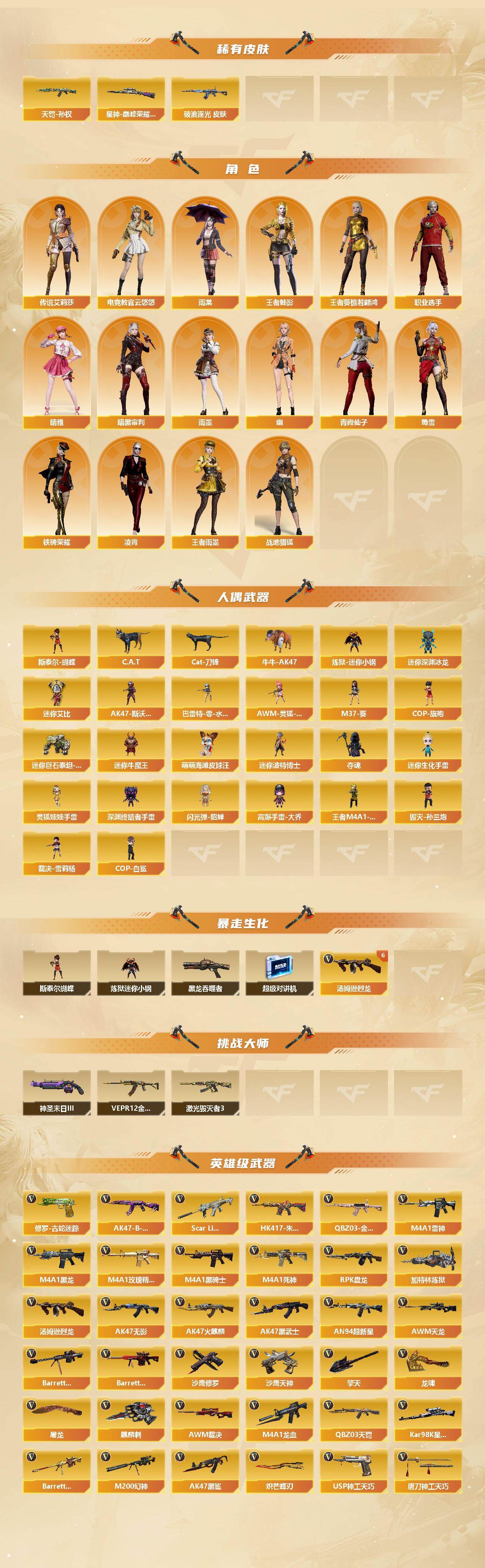 【稀有皮肤】:M200-幻神-黄忠皮肤,幻神-周瑜皮肤,幻神-丹凤,幻神-青鹤,幻神-宠儿-2021MVP,幻神-CFS2022,幻神-Heartshot 皮肤,幻神-曹操 皮肤,星神-巅峰荣耀 皮肤,Scar Light-白虎-暗星,白虎-大汉风骨,QBZ03-传奇宠儿,QBZ03-AG-CFPLS19冠军,金色蔷薇-破浪逐光 皮肤,雷神-荣耀之魄,雷神-耀金皮肤*2,雷神-传奇N9,M4A1-战神赵云,雷神-宠儿-2019MVP,雷神-R.LGD-CFPLS18冠军,雷神-荣耀世冠AG,火麒麟-AG战队皮肤,AK47-火麒麟-传奇EVEN,火麒麟-轻羽皮肤*3,火麒麟-战神关羽,火麒麟-平天大圣,火麒麟-盘古,火麒麟-荣耀世冠AG,火麒麟-百城,黑骑士-冠军之势,黑骑士-伏羲,黑龙-墨子皮肤,黑龙-冠军之武,毁灭耀金皮肤,毁灭-冠军之怒,毁灭-SV-CFPLS16冠军,毁灭-战神张飞,毁灭-BEAN-2020MVP,AWM-天龙-传奇70KG,AWM-天龙-传奇白鲨,天罚-孙