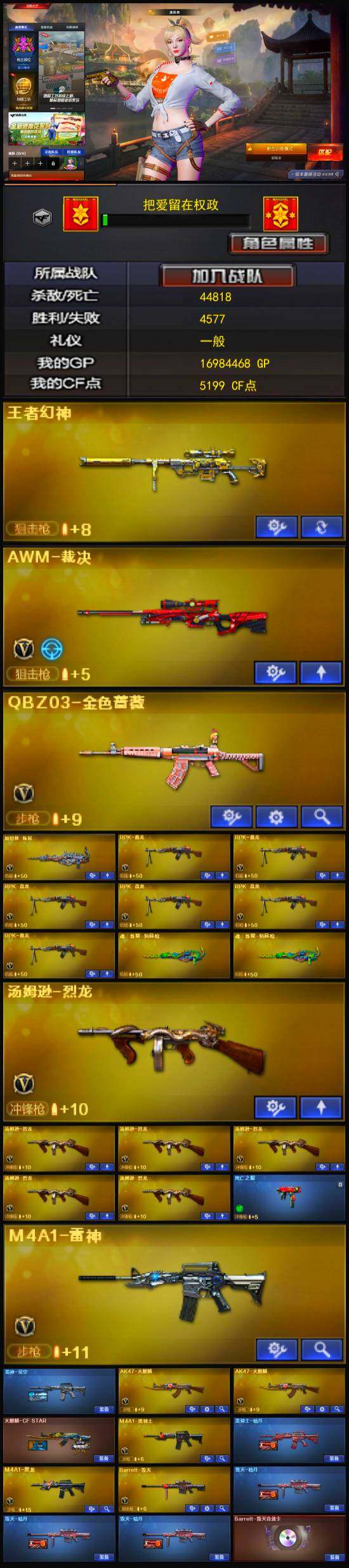 【热门武器】:王者幻神,QBZ03-金色蔷薇,死亡之眼,王者炎心,金色小号,Cat-刀锋,M4A1-黑骑士,汤姆逊-烈龙*6,RPK-盘龙*6,加特林-炼狱,沙鹰-修罗*4