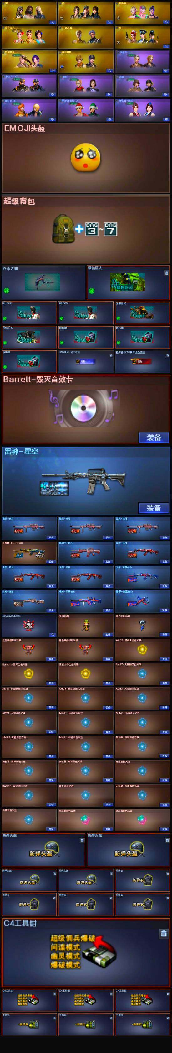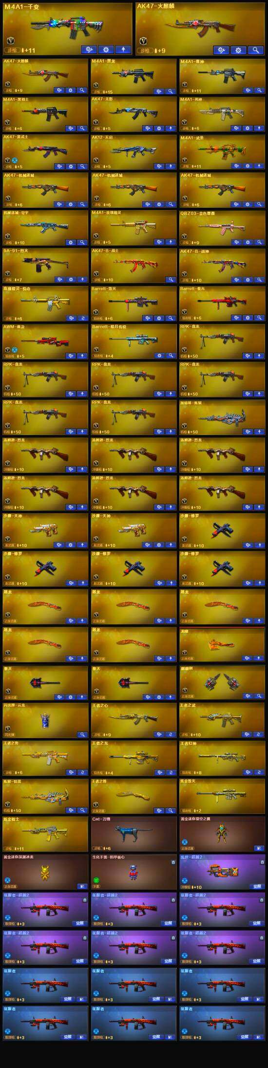 【英雄级武器】:M4A1-武圣,QBZ03-金色蔷薇,M4A1-雷神,M4A1-黑龙,M4A1-玫瑰精灵,M4A1-黑骑士,M4A1-死神,RPK-盘龙*6,加特林-炼狱,汤姆逊-烈龙*6,AK47-无影,AK47-火麒麟*2,AK47-黑武士,AK12-天启,AWM-天龙,Barrett-毁灭,Barrett-极光,AWM-裁决,AK47-机械迷城*3,M4A1-千变,AK-47-猩红传说*5,AK47-B-战神,M4A1-赤狱骑士,沙鹰-天神*2,沙鹰-修罗*4,麒麟刺,擎天*2,龙啸,屠龙*5