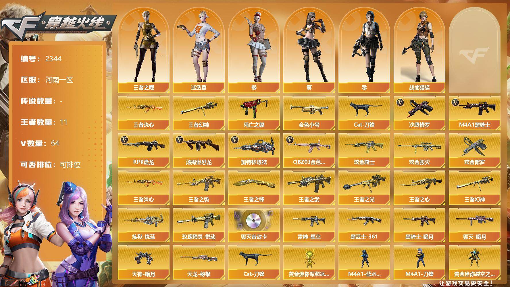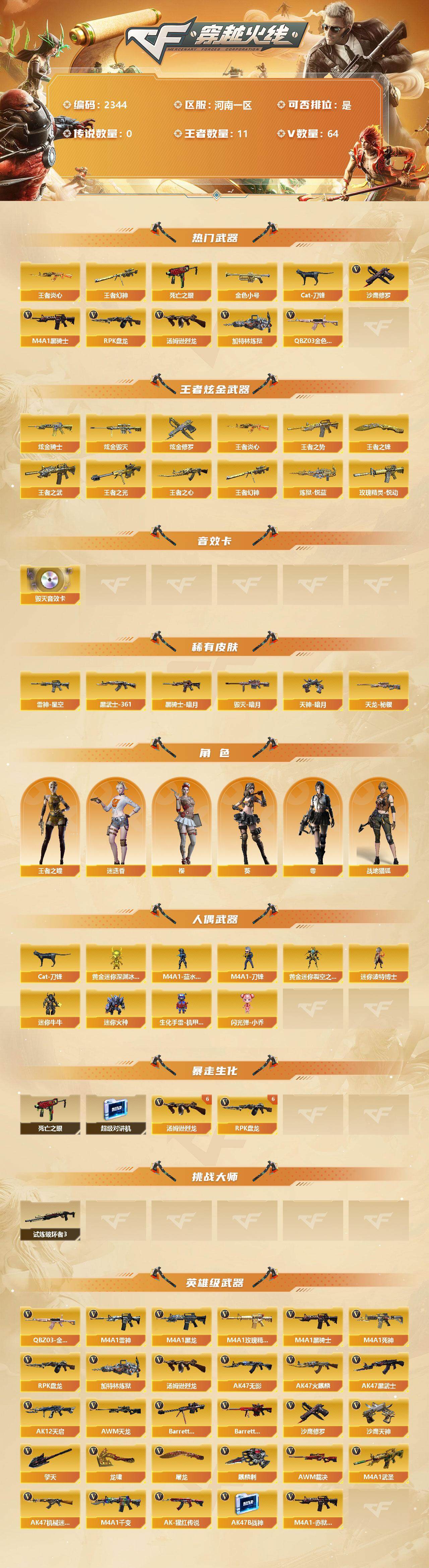 [11949133]【商品标题】:河南一区-64V-11王者-4炫金 【热门武器】:王者幻神,QBZ03-金色蔷薇,死亡之眼,王者炎心,金色小号,Cat-刀锋,M4A1-黑骑士,汤姆逊-烈龙*6,RPK-盘龙*6,加特林-炼狱,沙鹰-修罗*4 【王者炫金武器】:炫金骑士,炫金毁灭,炫金修罗*2,王者炎心,王者幻神,炼狱-悦蓝,王者之势,王者之武,玫瑰精灵-悦动,王者之光,王者之心,王者之锋 【音效卡】:Barrett-毁灭音效卡 【稀有皮肤】:雷神-星空,黑骑士-暗月,毁灭-暗月*3,天龙-秘银,AK47-黑武士-361,天神-暗月*6 【角色】:王者之瞳,零,葵,樱,迷迭香,战地猎狐 【人偶武器】:M4A1-蓝水晶-斯沃特精英,M4A1-刀锋,Cat-刀锋,黄金迷你深渊冰龙,黄金迷你裂空之翼,迷你波特博士*4,迷你牛牛,迷你火种*3,生化手雷-机甲核心,闪光弹-小乔 【暴走生化】:死亡之眼,超级对讲机 【挑战大师】:试炼破坏者III 【英雄级武器】:M4A1-武圣,QBZ03-金色蔷薇,M4A1-雷神,M4A1-黑龙,M4A1-玫瑰精灵,M4A1-黑骑士,M4A1-死神,RPK-盘龙*6,加特林-炼狱,汤姆逊-烈龙*6,AK47-无影,AK47-火麒麟*2,AK47-黑武士,AK12-天启,AWM-天龙,Barrett-毁灭,Barrett-极光,AWM-裁决,AK47-机械迷城*3,M4A1-千变,AK-47-猩红传说*5,AK47-B-战神,M4A1-赤狱骑士,沙鹰-天神*2,沙鹰-修罗*4,麒麟刺,擎天*2,龙啸,屠龙*5 【特殊枪械】:1黑骑士,6烈龙,6盘龙,1炼狱