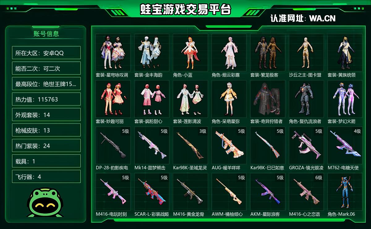- [11059461]WBDS0044 苹果Q 历史无敌战神 94套装 131枪皮 2神装18特效枪7车 镜域双华-欧若拉 (1级) 沙丘之主-图卡盟 (3级) AKM-熔岩统帅 (9级) 宾利BATUR(极速紫) 宾利欧陆GT火焰橘 越野奶龙龙 拉轰奶龙龙 Formula(巅峰兰) 黑曜夜骑 萌酷奶龙僚机 赤蝎幽灵 都市猎人 浪漫天命 圣堂之誓 小蓝 美雪 猪猪侠 绯穹魔姬 脉冲星 洛天依 夜幕颂歌 烟云彩露 小叽联名款 怪诞乔克 冰炎战车 祥瑞锦鲤 霓虹漫游 熔岩统帅 紫钛骑兵 幻影飞狐 缤纷油彩 M416-心之恋语 (1级) SCAR-L-魔童闹海哪吒 (3级) P90-沙丘之主 (3级) Kar98K-巳巳如意 (4级) M249-猪猪侠 (2级) MG3-酷泡奶龙 (4级) DP-28-豹影疾电 (4级) P90-能量风暴 (4级) PKM-江南烟雨 (2级) SCAR-L-天蓬元帅 (1级) M24-镜域双华 (3级) GROZA-巴啦啦小魔仙 (4级) M762-激战未来 (4级) DP-28-圣堂之誓 (2级) M416-暖熊萌萌 (5级) UMP45-玉魂晶魄 (3级) AKM-盖世英雄 (1级) 繁龙极客飞行器 祥瑞锦鲤飞行器 夜幕颂歌飞行器 龟仙人 雪山精英 鹰眼刺客 好奇恐龙 奶芙汪汪 激萌罗小黑 胖达团团 狼队追光队服 狼队战队服 暗影哥特 漫步者 破蛋小黄鸡 萌熊伴侣背包