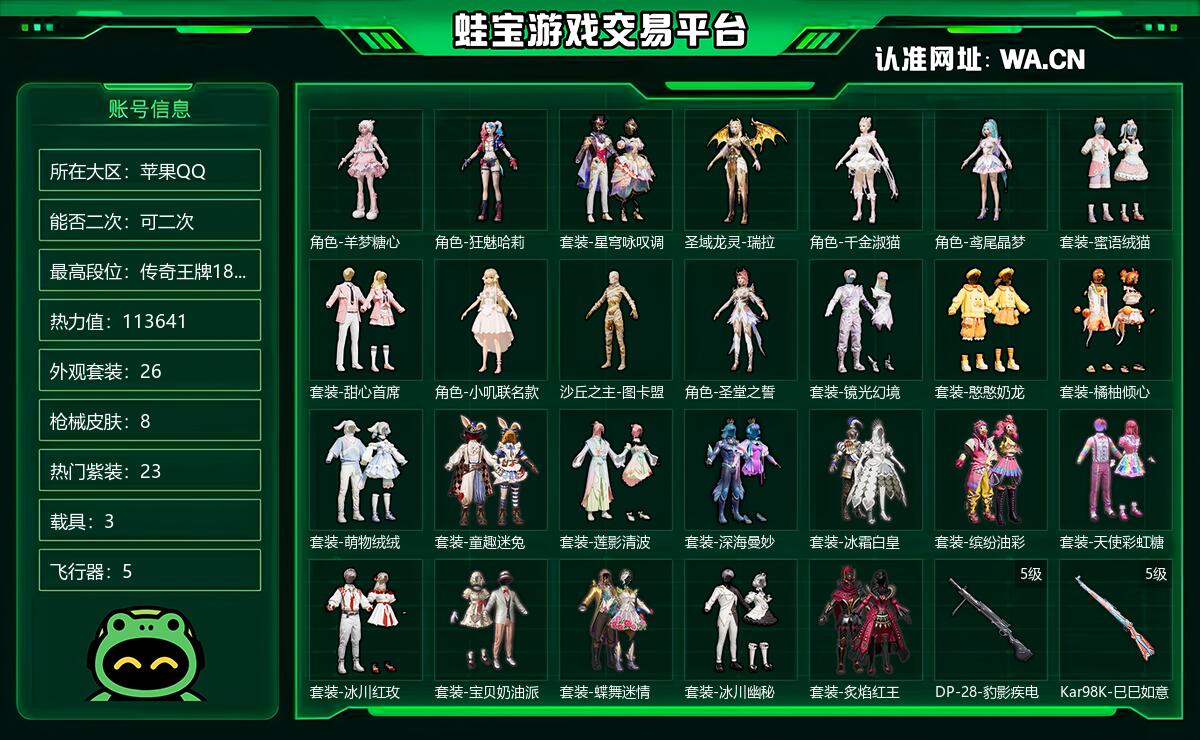 苹果QQ 可二次 当前段位不朽星钻Ⅳ 历史最高段位传奇王牌18星 热力值113641 等级70 套装248 王牌次数16 点券1 外观套装26 枪械皮肤8 热门紫装23 载具3 飞行器5 稀有0 头盔5 背包4