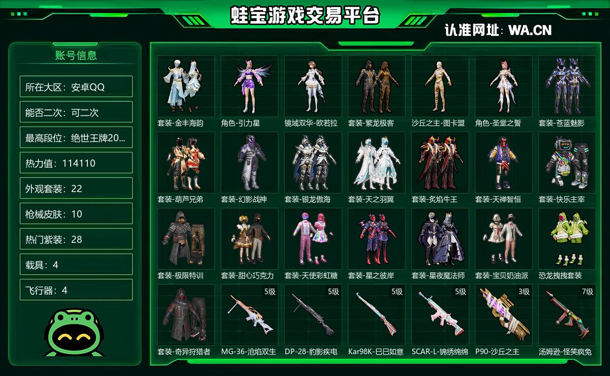 安卓QQ 可二次 当前段位不朽星钻Ⅱ 历史最高段位绝世王牌20星 热力值114110 等级74 套装229 王牌次数21 点券49 外观套装22 枪械皮肤10 热门紫装28 载具4 飞行器4 稀有0 头盔3 背包3