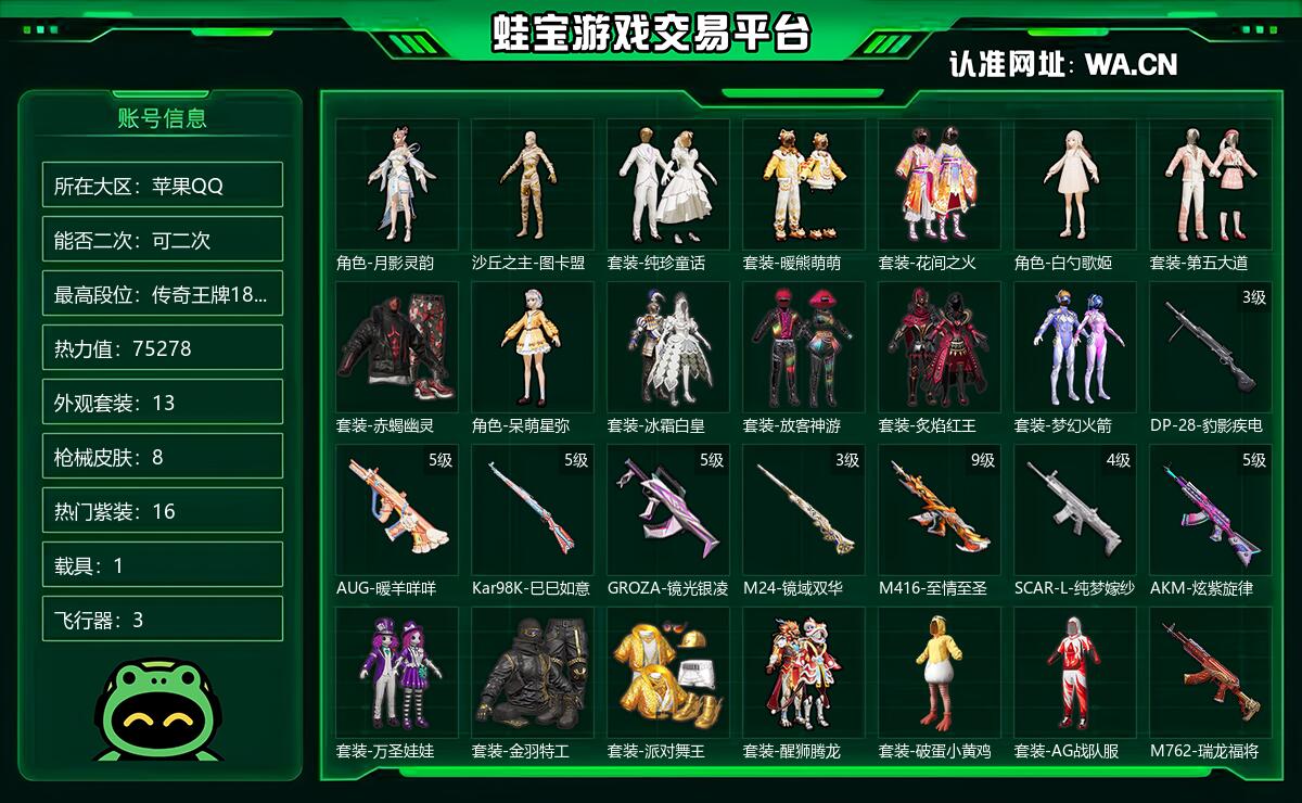 苹果QQ 可二次 当前段位超级王牌9星 历史最高段位传奇王牌18星 热力值75278 等级69 套装139 王牌次数13 点券15 外观套装13 枪械皮肤8 热门紫装16 载具1 飞行器3 稀有0 头盔2 背包1