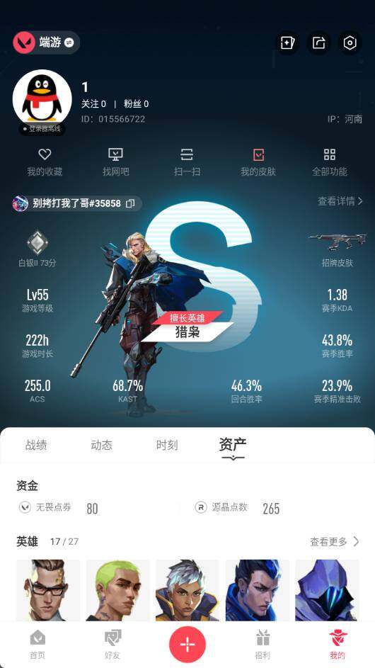 [12187237]皮肤资产价值3380【英雄】:幻棱,炼狱,暮蝶,钛狐,壹决,捷风,幽影,不死鸟,贤者,猎枭,零,芮娜,奇乐,尚勃勒,霓虹,夜露,盖可