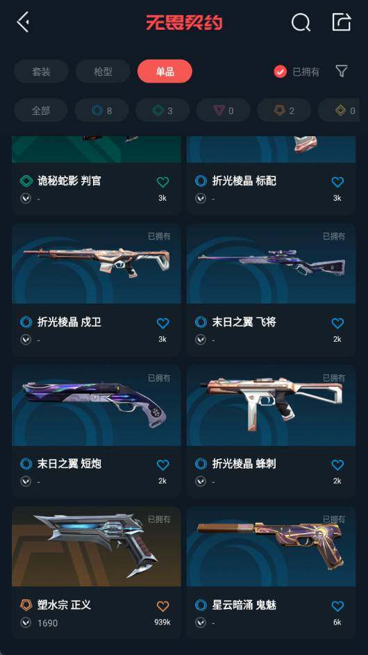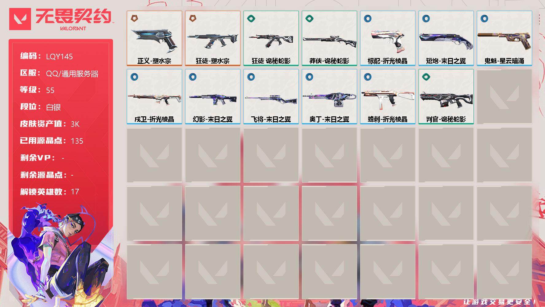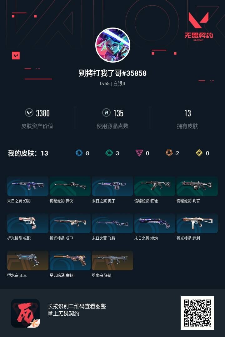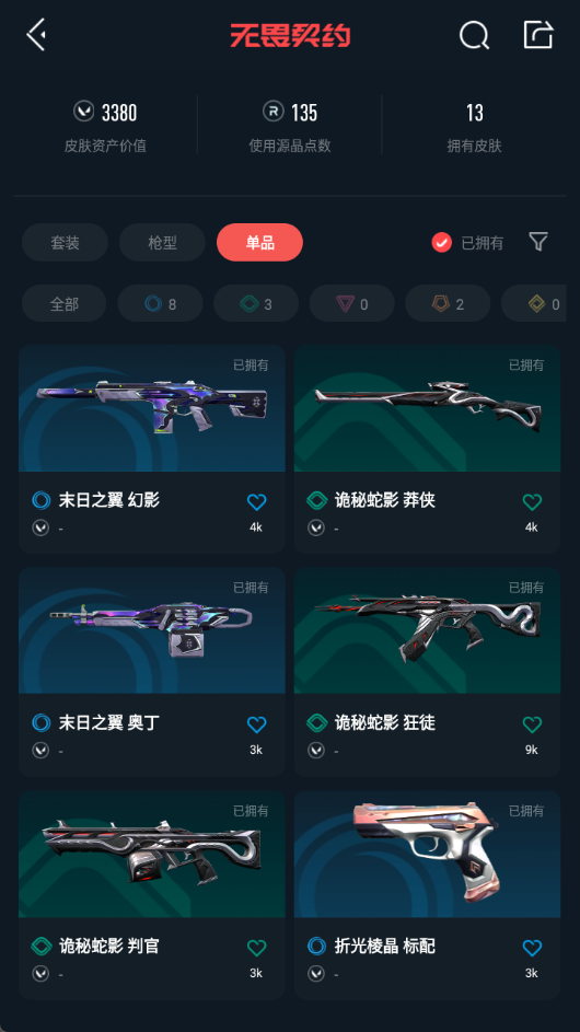 [12187237]皮肤资产价值3380【英雄】:幻棱,炼狱,暮蝶,钛狐,壹决,捷风,幽影,不死鸟,贤者,猎枭,零,芮娜,奇乐,尚勃勒,霓虹,夜露,盖可 【狂徒】:狂徒-塑水宗,狂徒-诡秘蛇影 【幻影】:幻影-末日之翼 【戍卫】:戍卫-折光棱晶 【飞将】:飞将-末日之翼 【莽侠】:莽侠-诡秘蛇影 【奥丁】:奥丁-末日之翼 【判官】:判官-诡秘蛇影 【蜂刺】:蜂刺-折光棱晶 【标配】:标配-折光棱晶 【正义】:正义-塑水宗 【鬼魅】:鬼魅-星云暗涌 【短炮】:短炮-末日之翼 【卡面】:精灵大战 卡面,南瓜盛典 卡面,树懒大作战 卡面,无垠星环 卡面,《双城之战》金克丝 卡面,代号红色 卡面,新兵报到 卡面,V契约 卡面,无畏契约 卡面 【喷漆】:控场勿近 喷漆,放下武器 喷漆,胜利属于无畏契约 喷漆,GLHF 喷漆,无畏契约 喷漆 【挂饰】:第九季//第三幕 纪念币 挂饰,动力机箱 挂饰,无畏契约 纪念币 挂饰