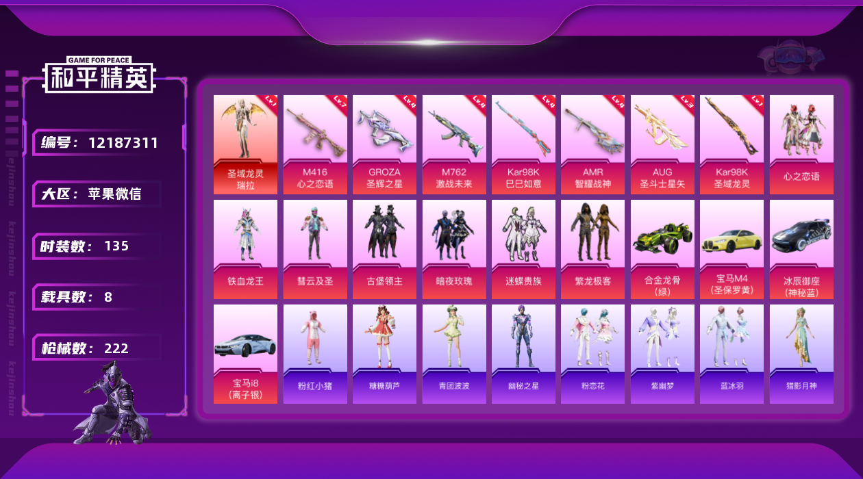 - PX_2063159- 苹果手Q-8王牌印记-2粉装-6特效枪-1载具-64712热力值-157套装-214枪皮-1卓越印记-0传奇印记 【2粉装】,恐龙拽拽,暗夜玫瑰 【6特效枪】AKM-绿萝繁花-4级 SCAR-L-锦绣绵绵-4级 M416-风花雪月-1级 M416-五爪金龙-6级 AUG-星之彼岸-5级 Kar98K-巳巳如意-3级 【6稀有紫装】,奇异狩猎者,浪漫天命,雪山精英,浪漫波比