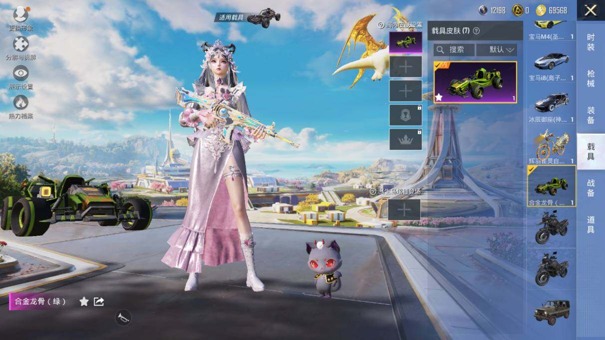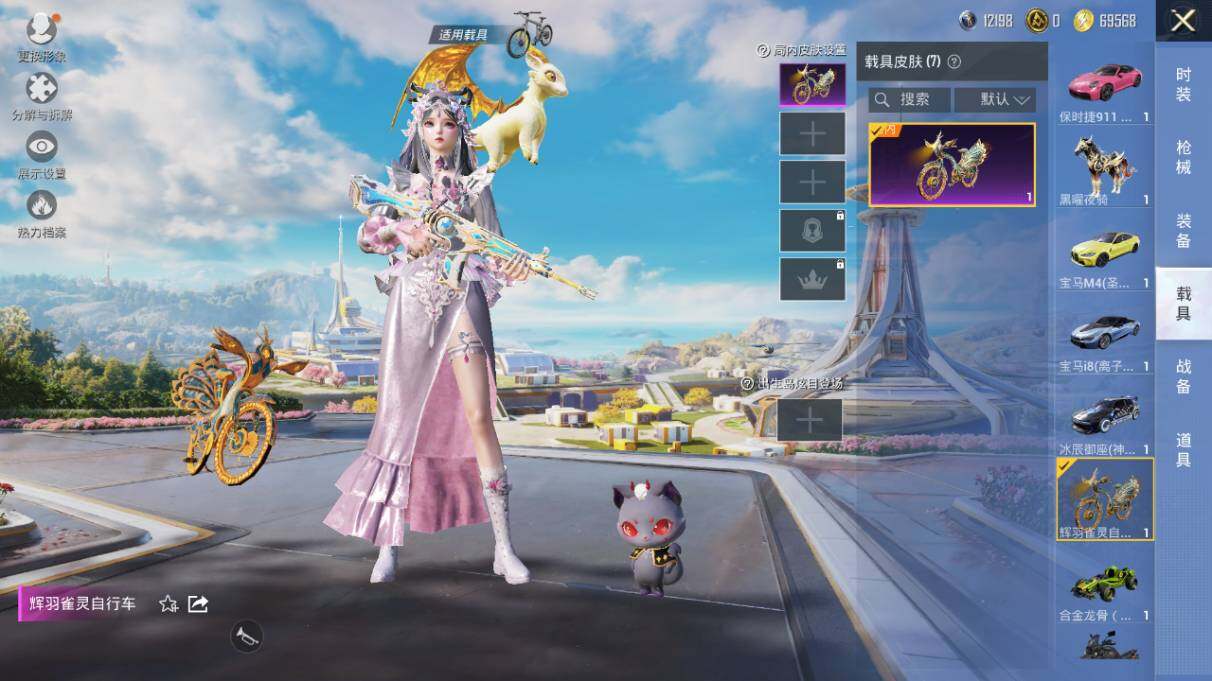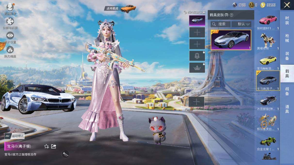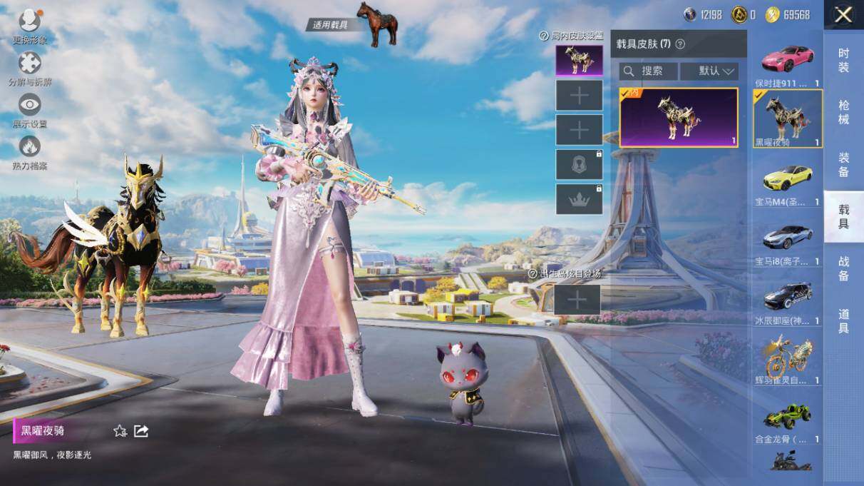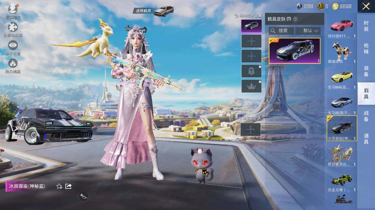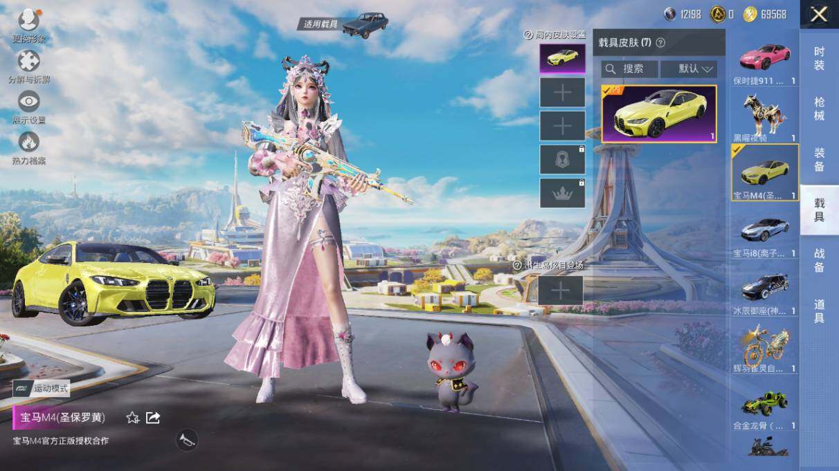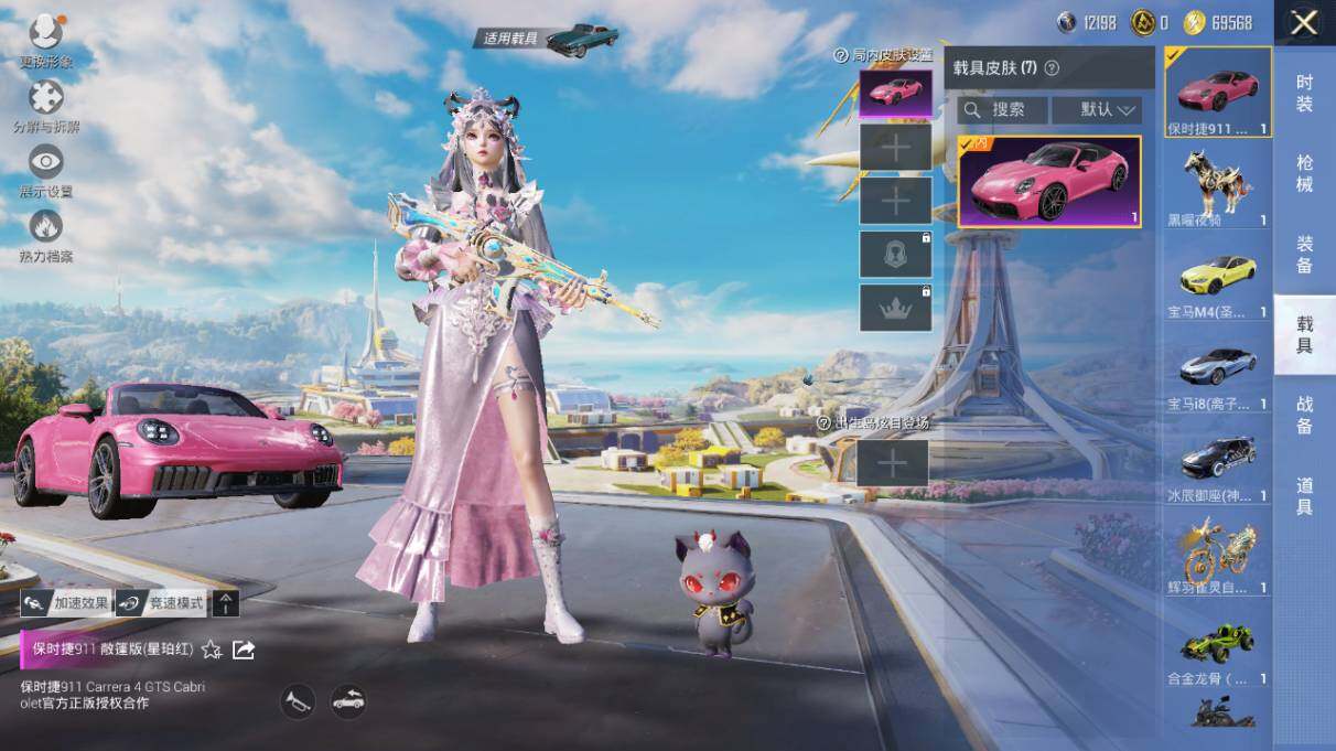 【粉色载具】:宝马i8(离子银),宝马M4(圣保罗黄),冰辰御座(神秘蓝),保时捷911 敞篷版(星珀红),合金龙骨(绿),僚机-圣域龙宝,黑曜夜骑,辉羽雀灵自行车
