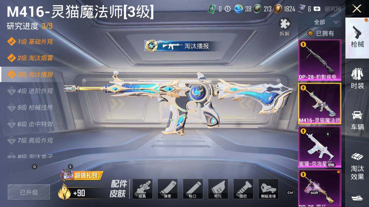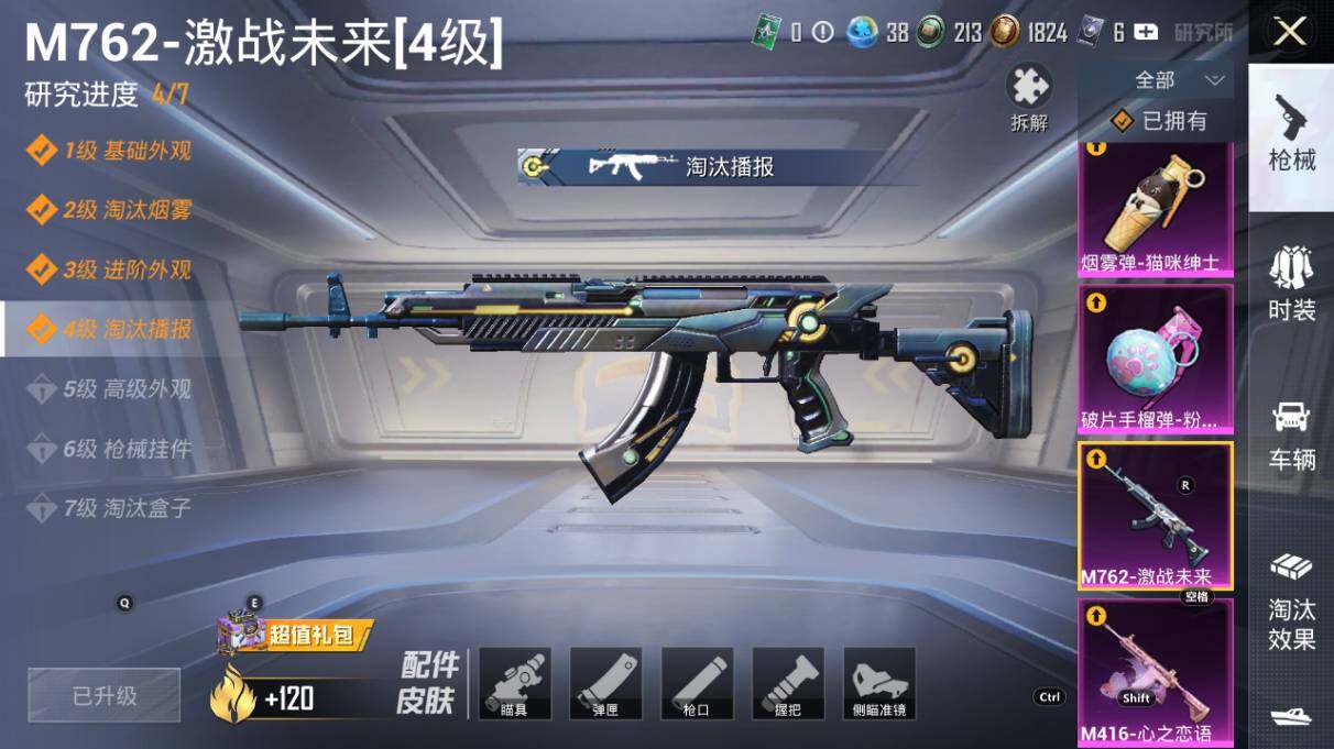 M416-心之恋语,GROZA-圣辉之星,M762-激战未来,Kar98K-巳巳如意,Kar98K-圣域龙灵,烟雾弹-猫咪绅士,破片手榴弹-粉粉猫爪