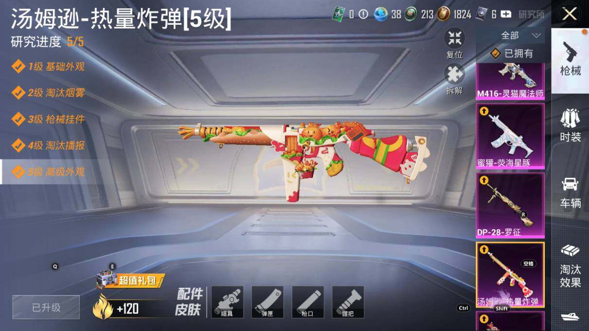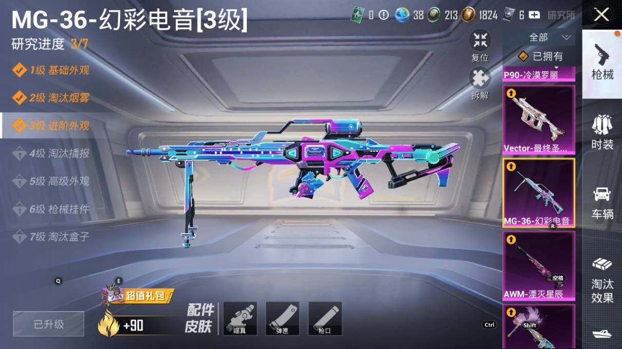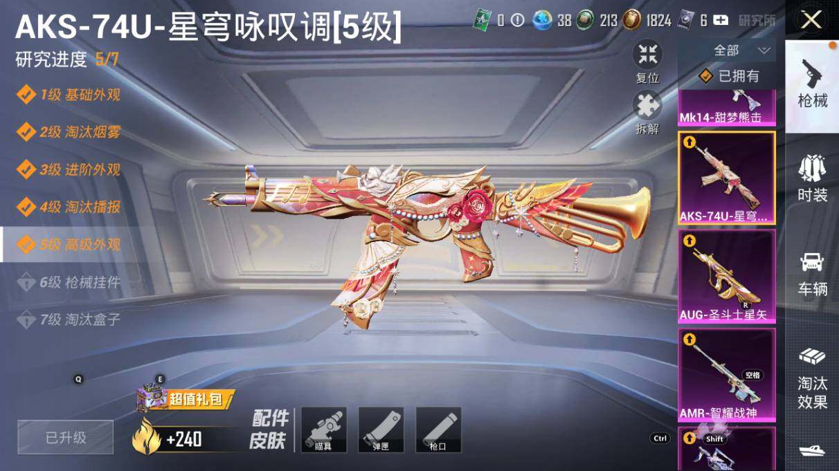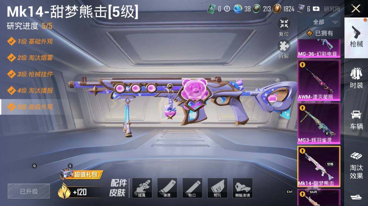 【粉色枪皮等级】:M416-心之恋语(七级),M416-灵猫魔法师(三级),GROZA-圣辉之星(四级),AUG-圣斗士星矢(三级),M762-激战未来(四级),蜜獾-荧海星豚(三级),Vector-最终圣卫者(三级),汤姆逊-热量炸弹(五级),野牛-绯月迷踪(三级),AKS-74U-星穹咏叹调(五级),P90-冷漠罗丽(四级),Kar98K-巳巳如意(四级),Kar98K-圣域龙灵(一级),AWM-湮灭星辰(三级),Mk14-甜梦熊击(五级),AMR-智耀战神(四级),DP-28-罗征(一级),DP-28-豹影疾电(五级),MG3-辉羽雀灵(三级),MG-36-幻彩电音(三级)