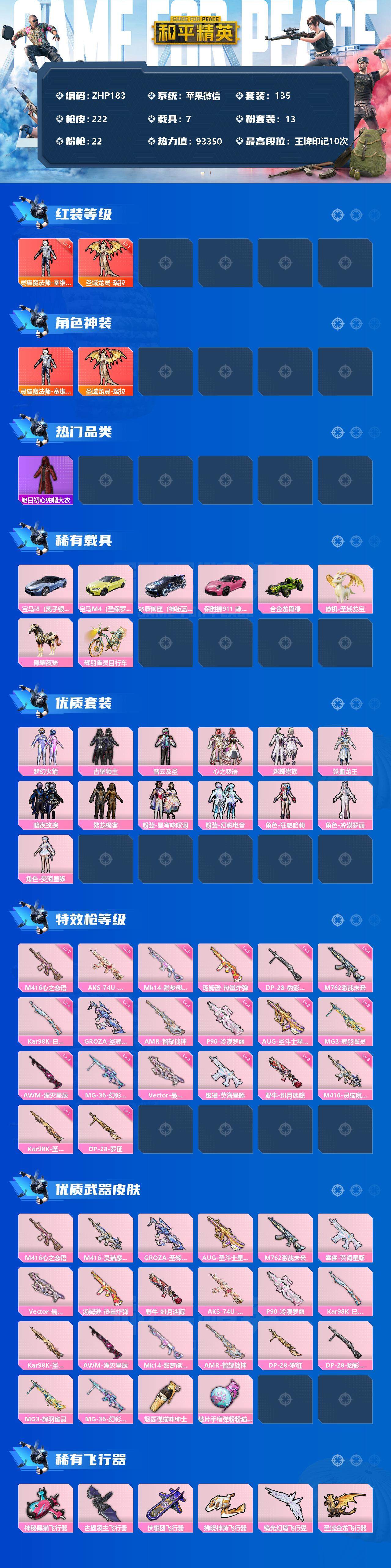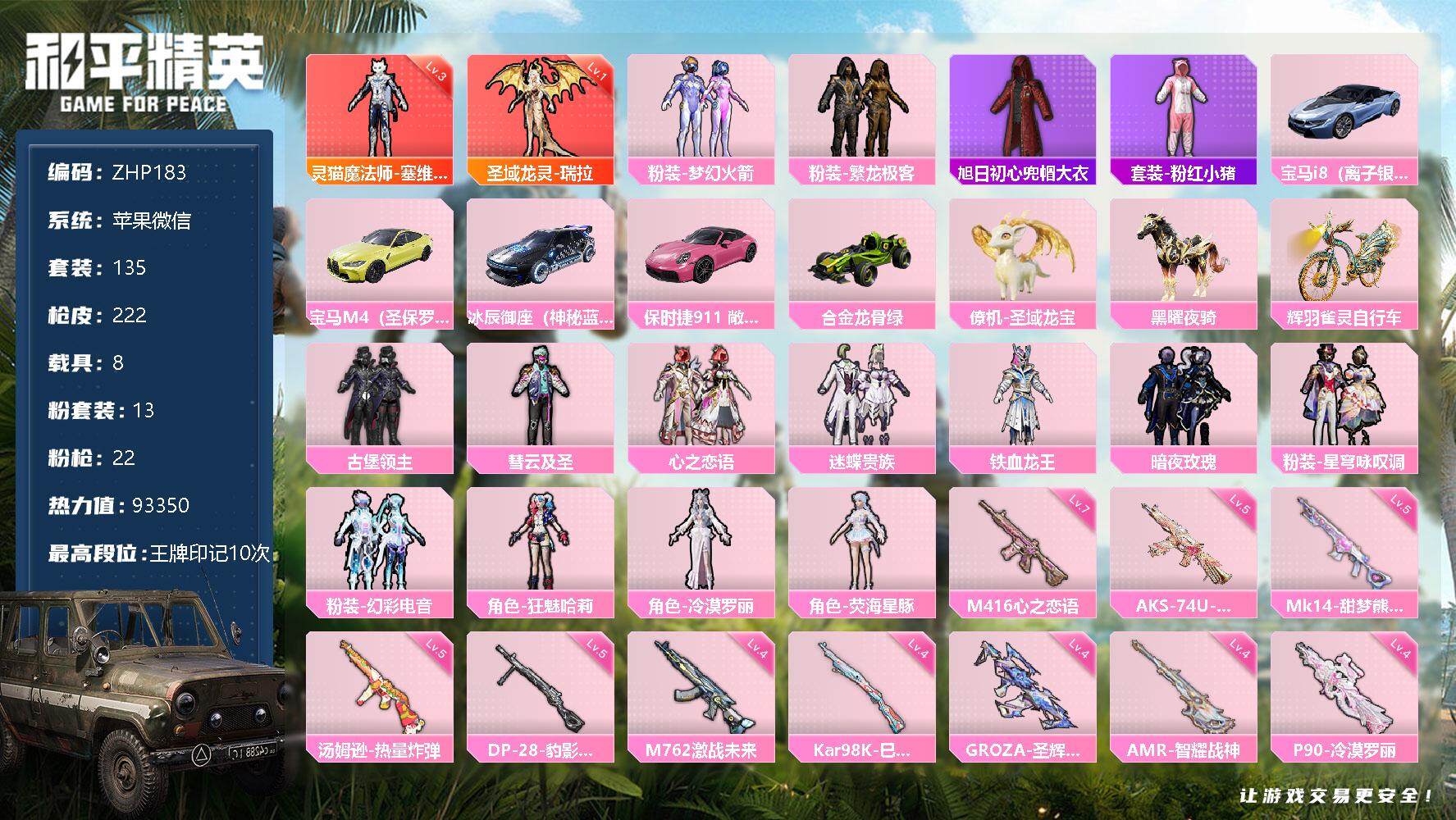 [12187311]身法素材【特价急出/详情看图】3级灵猫!粉车多!:苹果 微信-2神装-13粉装-22特效枪-7载具-9粉色飞行器-93350热力值-10王牌印记-135套装-222枪皮