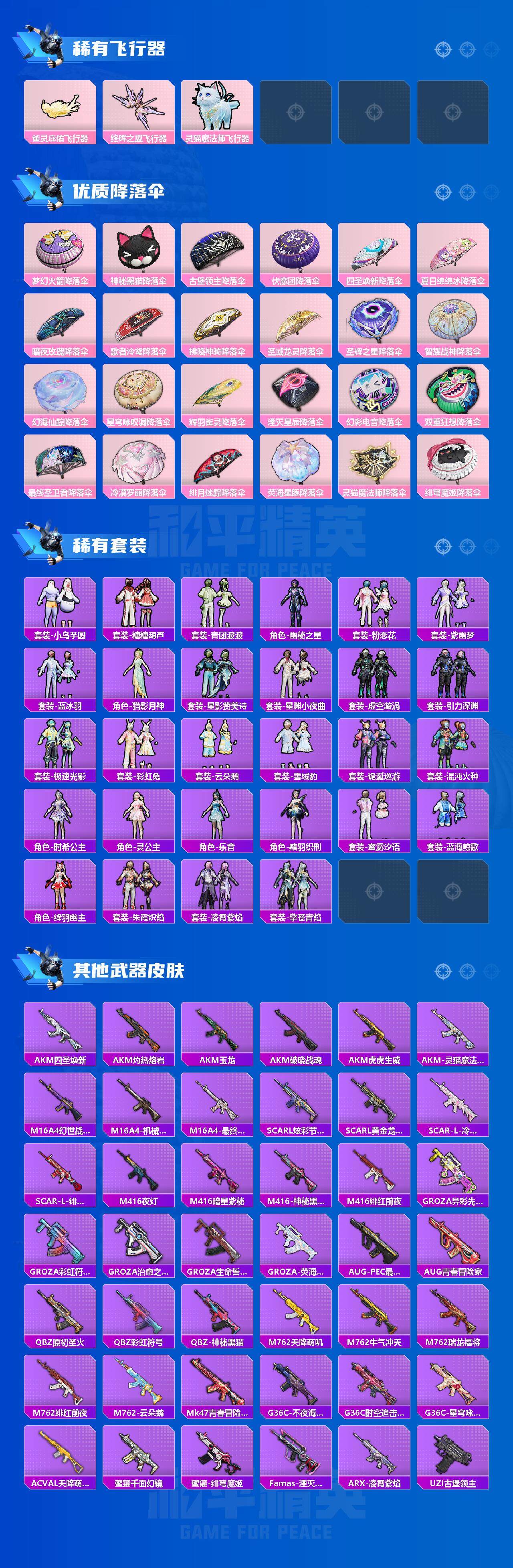 - PX_2093844- 苹果微信-3王牌印记-2粉装-13特效枪-2载具-32683热力值-38套装-79枪皮-3卓越印记-2传奇印记 【2粉装】,星穹咏叹调,荧海星豚 【13特效枪】AKM-幽焰骑士-3级 M416-墨龙九天-3级 AUG-暖羊咩咩-5级 Kar98K-巳巳如意-5级 AMR-鸢尾晶梦-5级 Mk14-盛世惊鸿-3级 UZI-圣斗士星矢-3级 AKS-74U-星穹咏叹调-4级 M