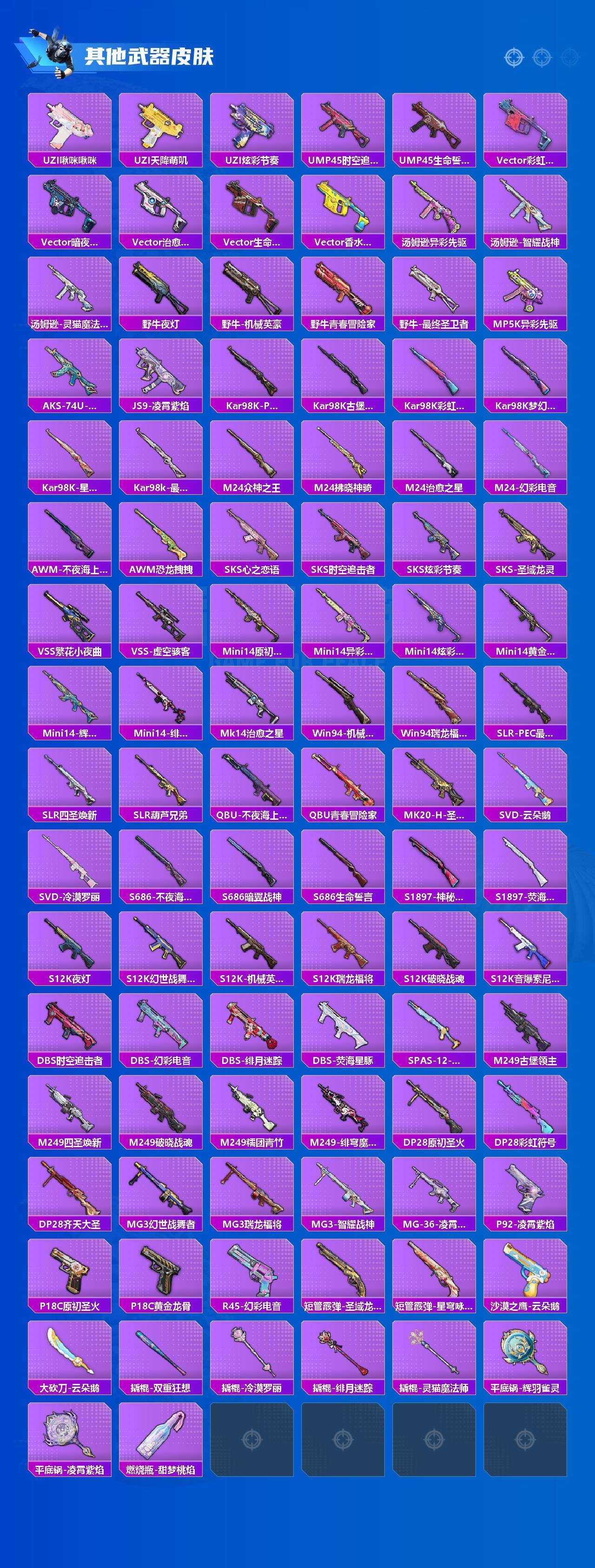 【粉色枪皮】:M416-心之恋语,M416-灵猫魔法师,GROZA-圣辉之星,AUG-圣斗士星矢,M762-激战未来,蜜獾-荧海星豚,Vector-最终圣卫者,汤姆逊-热量炸弹,野牛-绯月迷踪,AKS-74U-星穹咏叹调,P90-冷漠罗丽,Kar98K-巳巳如意,Kar98K-圣域龙灵,AWM-湮灭星辰,Mk14-甜梦熊击,AMR-智耀战神,DP-28-罗征,DP-28-豹影疾电,MG3-辉羽雀灵,MG-36-幻彩电音,烟雾弹-猫咪绅士,破片手榴弹-粉粉猫爪