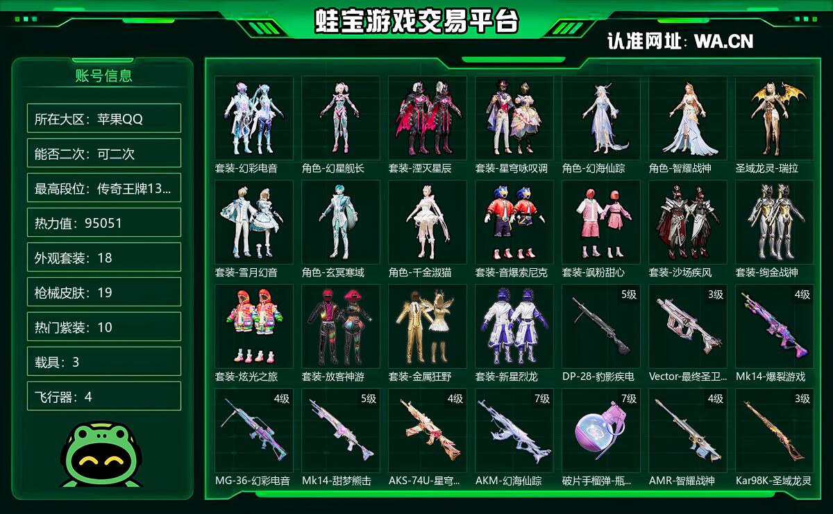苹果QQ 可二次 当前段位不朽星钻Ⅴ 历史最高段位传奇王牌13星 热力值95051 等级67 套装189 王牌次数7 点券10 外观套装18 枪械皮肤19 热门紫装10 载具3 飞行器4 稀有0 头盔1 背包3