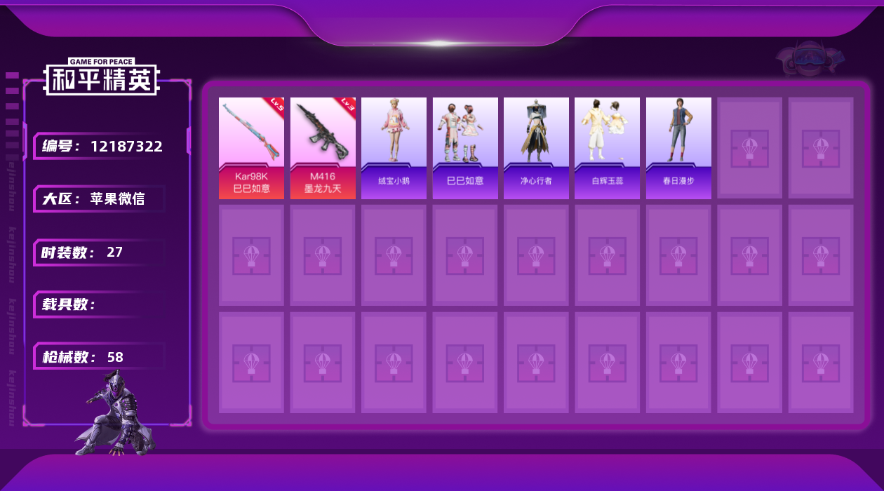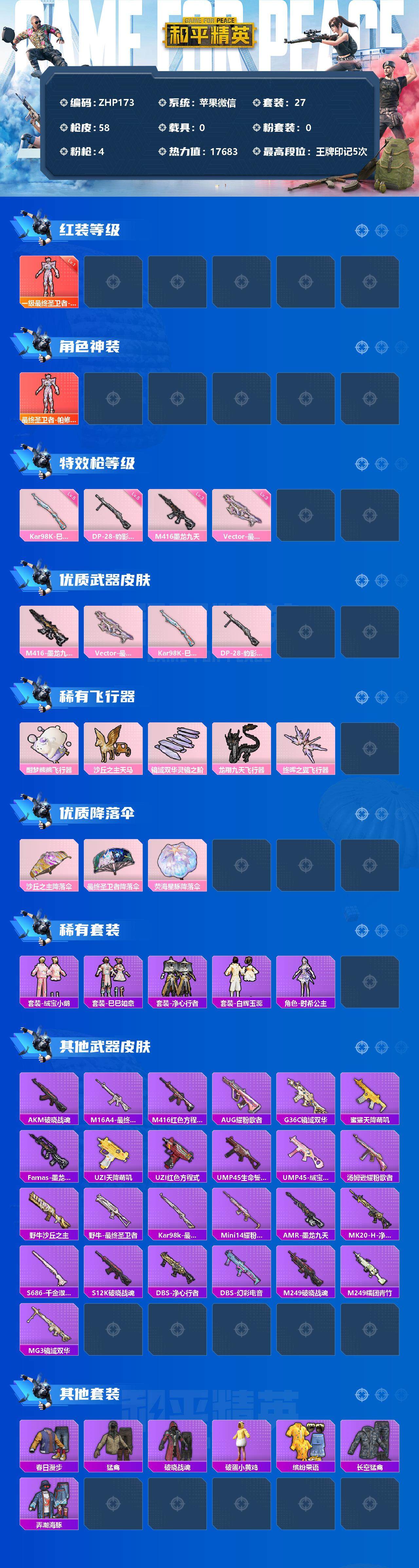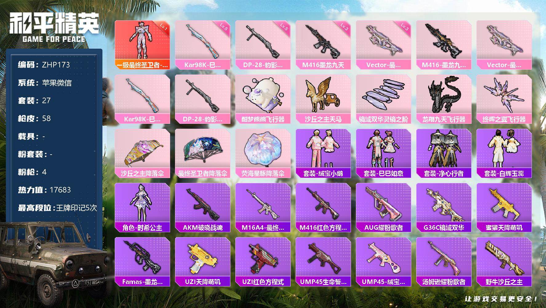 [12187322]【商品标题】:苹果 微信-1神装-0粉装-4特效枪-0载具-5粉色飞行器-17683热力值-5王牌印记-27套装-58枪皮