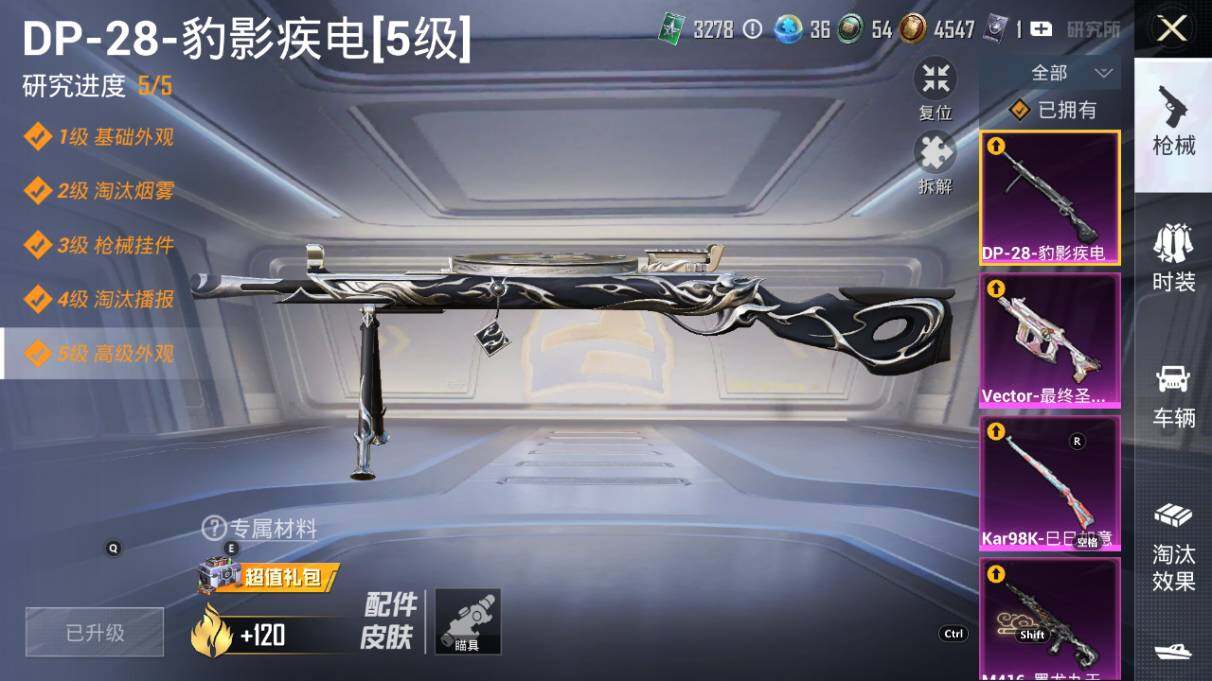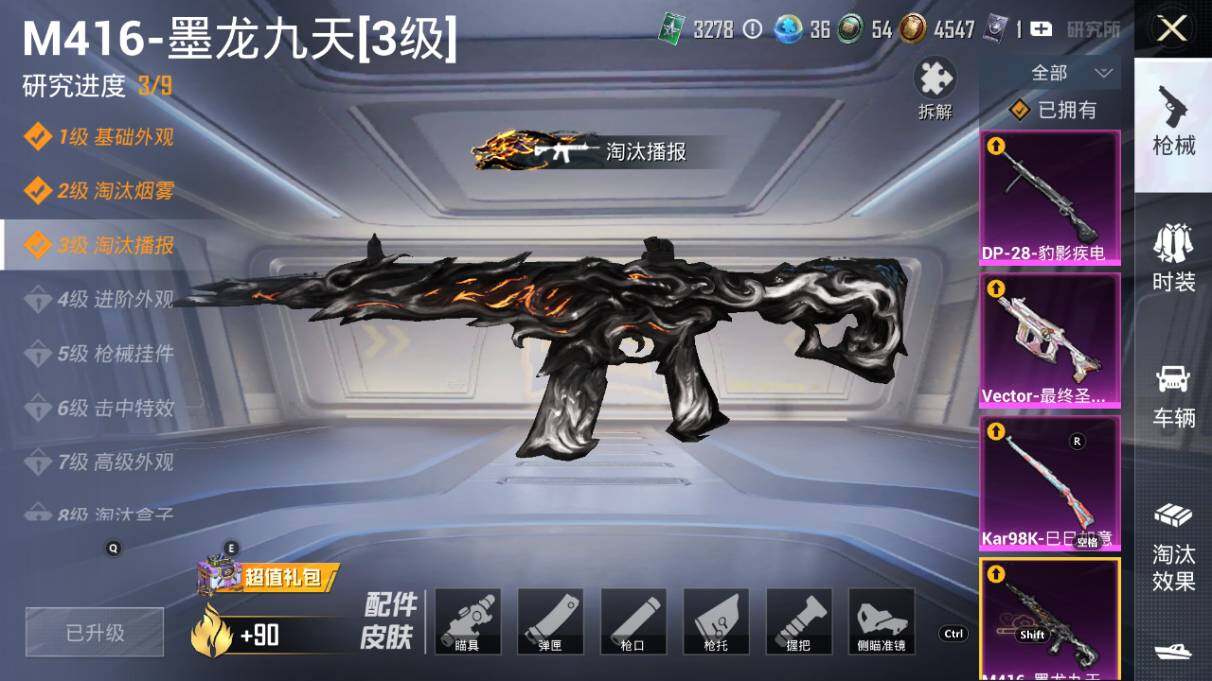 【粉色枪皮等级】:M416-墨龙九天(三级),Vector-最终圣卫者(三级),Kar98K-巳巳如意(五级),DP-28-豹影疾电(五级)