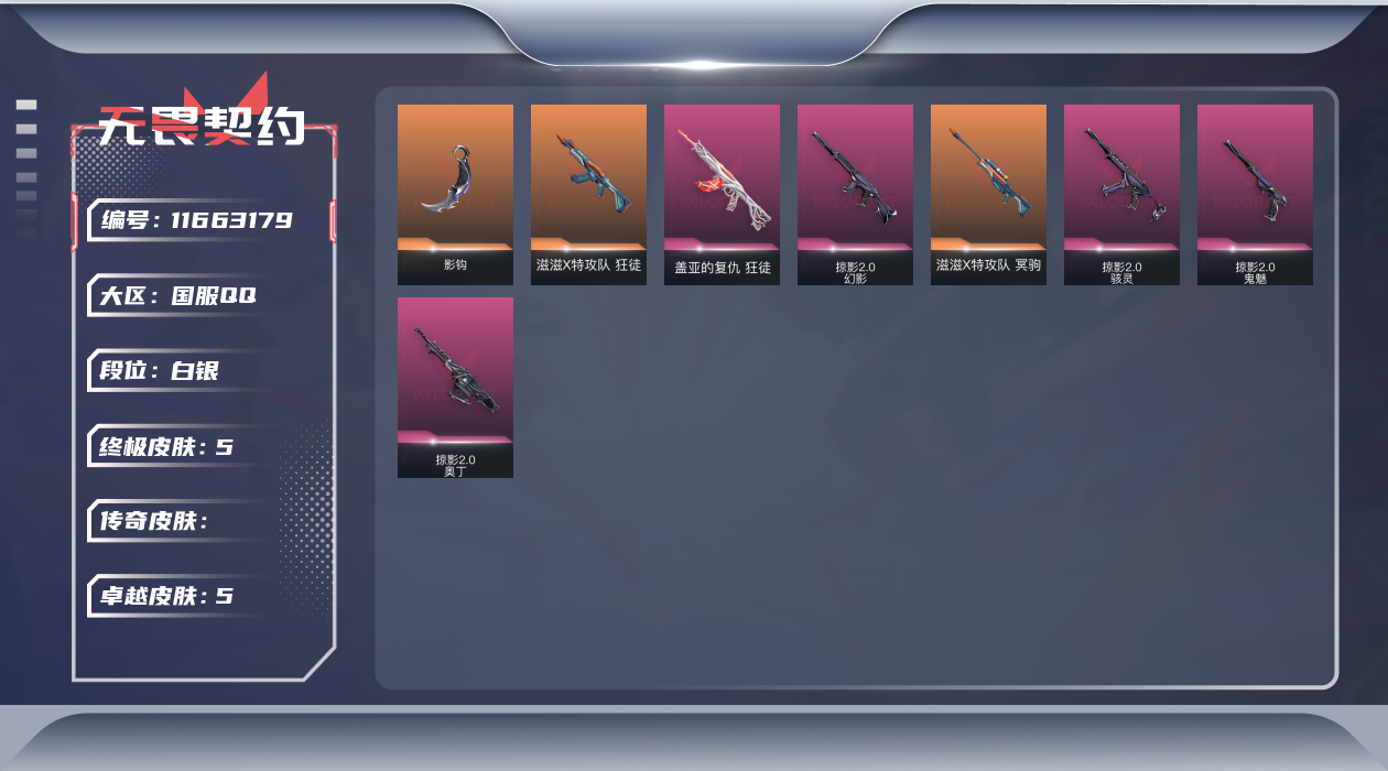[11663179]【套装】:滋滋X特攻队套装,掠影//2.0套装 【英雄】:炼狱,壹决,捷风,雷兹,不死鸟,贤者,猎枭,零,芮娜,尚勃勒,夜露,盖可 【近战 武器】:近战武器-嘟昂嘟昂超弹力水球拳套,近战武器-影钩 【狂徒】:狂徒-滋滋X特攻队,狂徒-盖亚的复仇 【幻影】:幻影-掠影//2.0 【冥驹】:冥驹-滋滋X特攻队 【奥丁】:奥丁-掠影//2.0 【骇灵】:骇灵-掠影//2.0 【鬼魅】:鬼魅-掠影//2.0 【卡面】:树懒大作战 卡面,Clutch 卡面,无畏契约:尚勃勒 卡面,无畏契约GO!第一卷:芮娜 卡面,无畏契约GO!第一卷:零 卡面,《双城之战》金克丝 卡面,代号红色 卡面,新兵报到 卡面,V契约 卡面,无畏契约 卡面 【喷漆】:致命优雅 喷漆,霓光四射 喷漆,买装还是存钱 喷漆,关门放狗 喷漆,胜利属于无畏契约 喷漆,GLHF 喷漆,无畏契约 喷漆 【挂饰】:无畏契约GO!第一卷 芮娜 挂饰,无畏契约GO!第一卷 零 挂饰,天外飞客 挂饰,无畏契约 纪念币 挂饰
