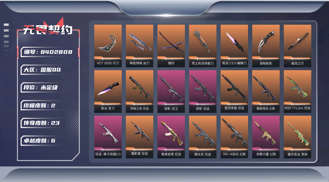 [8402808]连体号:无畏 皮肤77,刀皮11枪皮66(终极2传奇23卓越6),套装3(传奇3) LOL 239皮肤 48炫彩 12臻彩 11神话/65限定/34传说/128英雄 无畏契约-QQ-通用服务器 Lv107 ,皮肤总价值75330,铂金III,总皮肤77,刀皮11枪皮66(终极2传奇23卓越6),套装3(传奇3) 【拥有套装】西部未来套装(西部未来-幻影,西部未来-奥丁,西部未来-飞将,西部未来-正义,未来开拓者)归零者2.0套装(归零者//2.0-幻影,归零者//2.0-戍卫,归零者//2.0-莽侠,归零者//2.0-正义,生物分子解离器) 【拥有近战武器】诡秘蛇影-军刀,VCT-2025-爪刀,神圣领域-战刀,荒土机兵-热能刀,镭切,奇点//2.0-蝴蝶刀,奇点-军刀,威龙之刃, 【拥有步枪】RGX-11z-Pro-狂徒,噬影者-狂徒,混沌序曲-狂徒,双城之战-狂徒,黯夜怪谈-幻影,塑水宗-狂徒,781-A协议-幻影,离子武器//2.0-狂徒,紫阙金琅-狂徒,侦察力量-幻影,掠影-狂徒,掠影-戍卫【拥有狙击枪】偃月苍龙-冥驹 【拥有手枪】VCT25-x-EDG-标配,VCT25-x-BLG-标配,塑水宗-正义,奇点//2.0-鬼魅,艾沃莉的梦之翼-鬼魅,天界神兵-鬼魅, 英雄联盟(LOL)-电信-黑色玫瑰 239皮肤 48炫彩 12臻彩 11神话/65限定/34传说/128英雄 账号等级:194 单双排段位:不屈白银【重要皮肤】双城之战2指挥官凯特琳至臻 狼神英灵斯维因至臻 暗星女王黛安娜至臻 魔域梦魇泽丽至臻 至高天凯尔至臻 心之钢永恩至臻 灵魂莲华易至臻 真实伤害赛娜至臻 殿堂传奇乐芙兰 零之枪骑赫卡里姆 胜利女神娑娜 胜利之王泰达米尔 胜利巨口克格莫 玉剑传说无影 玉剑传说舞剑仙 神凰行者烈羽焰凰霞 黎明使者薇恩 碧玉之牙卡西奥佩娅 甜心宝贝安妮 觅心女王艾希 双城之战2指挥官凯特琳 双城之战2幸存者杰斯 双城之战2微光实验室辛吉德 北极星神黛安娜 北极星圣贤基兰 北极星使者萨科 冰雪驯鹿波比 冰封王子蒙多 平安夜女神娑娜 魅惑女巫迦娜 魅惑女巫莫甘娜 魅惑女巫崔丝塔娜 大魔王提莫 死亡誓约卡特琳娜 海之歌艾希 泳池派对凯特琳 泳池派对普朗克 泳池派对奥莉安娜 泳池派对塔莉垭 泳池派对厄运小姐 泳池派对菲奥娜 泳池派对格雷福斯