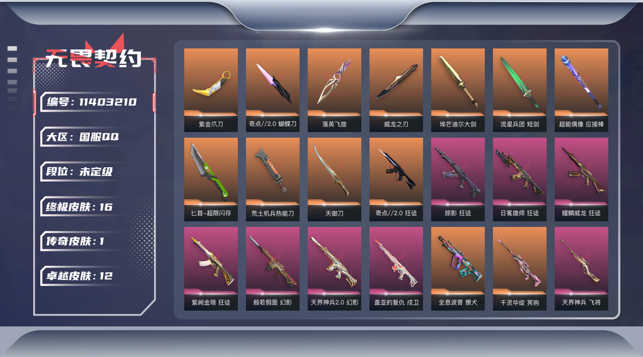 [11403210]【套装】:奇点//2.0套装,耀鳞威龙套装,天界神兵//2.0套装 【英雄】:炼狱,维斯,暮蝶,钛狐,壹决,铁臂,捷风,雷兹,幽影,不死鸟,贤者,猎枭,蝰蛇,零,芮娜,奇乐,尚勃勒,霓虹,斯凯,夜露,星礈,K/O,海神,盖可,黑梦,钢锁 【近战 武器】:近战武器-紫金爪刀,近战武器-奇点//2.0 蝴蝶刀,近战武器-落英飞旋,近战武器-威龙之刃,近战武器-埃芒迪尔大剑,近战武器-流星兵团 短剑,近战武器-超能偶像 应援棒,近战武器-超限闪存 匕首,近战武器-荒土机兵 热能刀,近战武器-天御刀 【狂徒】:狂徒-奇点//2.0,狂徒-掠影,狂徒-日冕雄师,狂徒-耀鳞威龙,狂徒-紫阙金琅,狂徒-超能偶像,狂徒-荒土机兵,狂徒-流星兵团 【幻影】:幻影-般若假面,幻影-天界神兵//2.0,幻影-超限闪存,幻影-聚合之力,幻影-纳米打击 【戍卫】:戍卫-盖亚的复仇,戍卫-超能偶像,戍卫-浮光跃金,戍卫-逆冲蛮牛,戍卫-战术熊与伙伴们 【獠犬】:獠犬-全息波普,獠犬-采蜜小蜂队,獠犬-模拟赫兹,獠犬-逆冲蛮牛 【冥驹】:冥驹-千灵华绽,冥驹-荒土机兵,冥驹-模拟赫兹 【飞将】:飞将-天界神兵,飞将-聚合之力,飞将-战术熊与伙伴们 【莽侠】:莽侠-超限闪存,莽侠-纤云弄巧 【战神】:战神-极简主义,战神-采蜜小蜂队,战神-浮光跃金 【奥丁】:奥丁-天界神兵//2.0,奥丁-流星兵团,奥丁-纳米打击 【判官】:判官-天界神兵//2.0,判官-超能偶像,判官-采蜜小蜂队,判官-纳米打击x 【雄鹿】:雄鹿-复古浪潮,雄鹿-模拟赫兹,雄鹿-逆冲蛮牛 【骇灵】:骇灵-781-A协议,骇灵-荒土机兵,骇灵-流星兵团,骇灵-珍珠棘贝,骇灵-浮光跃金 【蜂刺】:蜂刺-超限闪存,蜂刺-聚合之力,蜂刺-深海水族,蜂刺-纤云弄巧 【标配】:标配-超能偶像,标配-荒土机兵,标配-浮光跃金,标配-战术熊与伙伴们 【VCT手枪】:标配-VCT x LEV 【正义】:正义-塑水宗,正义-超限闪存,正义-纳米打击,正义-纤云弄巧 【鬼魅】:鬼魅-奇点//2.0,鬼魅-耀鳞威龙,鬼魅-流星兵团,鬼魅-采蜜小蜂队,鬼魅-模拟赫兹,鬼魅-星云暗涌 【狂怒】:狂怒-天界神兵//2.0,狂怒-珍珠棘贝,狂怒-聚合之力,狂怒-逆冲蛮牛,狂怒-战术熊与伙伴们 【短炮】:短炮-深海水族,短炮-纤云弄巧 【卡面】:终章:激斗汉