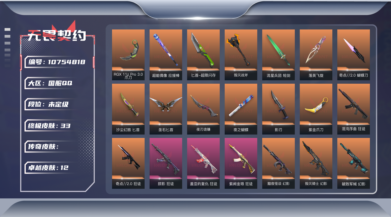 [10754818]【套装】:千灵华绽套装,奇点//2.0套装,黯夜怪谈套装,毁灭骑士套装,回火礼包:奇点套装,掠影套装 【英雄】:炼狱,维斯,暮蝶,壹决,铁臂,捷风,雷兹,幽影,不死鸟,贤者,猎枭,蝰蛇,零,芮娜,奇乐,尚勃勒,霓虹,斯凯,夜露,星礈,K/O,盖可,黑梦,钢锁 【近战 武器】:近战武器-RGX 11z Pro//3.0 爪刀,近战武器-超能偶像 应援棒,近战武器-超限闪存 匕首,近战武器-毁灭战斧,近战武器-流星兵团 短剑,近战武器-落英飞旋,近战武器-奇点//2.0 蝴蝶刀,近战武器-沙尘幻旅 匕首,近战武器-圣石匕首,近战武器-夜刃诡镰,近战武器-夜之蝴蝶,近战武器-影刃,近战武器-紫金爪刀 【标配】:标配-黯夜怪谈,标配-超能偶像,标配-荒土机兵,标配-浮光跃金,标配-战术熊与伙伴们,标配-最终庇护 【VCT手枪】:标配-VCT x KRÜ 【短炮】:短跑-纤云弄巧 【狂怒】:狂怒-紫阙金琅//2.0,狂怒-聚合之力,狂怒-萌彩剪影,狂怒-逆冲蛮牛,狂怒-战术熊与伙伴们 【鬼魅】:鬼魅-奇点//2.0,鬼魅-灵魂冲击,鬼魅-流星兵团,鬼魅-采蜜小蜂队,鬼魅-光导纤维,鬼魅-胡桃狂想,鬼魅-模拟赫兹 【正义】:正义-毁灭骑士,正义-奇点,正义-千灵华绽,正义-掠影,正义-超限闪存,正义-沙尘幻旅,正义-复古浪潮,正义-纤云弄巧 【蜂刺】:蜂刺-超限闪存,蜂刺-胡桃狂想,蜂刺-聚合之力,蜂刺-纤云弄巧 【骇灵】:骇灵-奇点,骇灵-荒土机兵,骇灵-流星兵团,骇灵-沙尘幻旅,骇灵-浮光跃金 【雄鹿】:雄鹿-模拟赫兹,雄鹿-逆冲蛮牛 【判官】:判官-毁灭骑士,判官-千灵华绽,判官-超能偶像,判官-采蜜小蜂队,判官-萌彩剪影,判官-纳米打击x 【獠犬】:獠犬-黯夜怪谈,獠犬-采蜜小蜂队,獠犬-胡桃狂想,獠犬-模拟赫兹,獠犬-逆冲蛮牛 【戍卫】:戍卫-掠影,戍卫-紫阙金琅,戍卫-超能偶像,戍卫-浮光跃金,戍卫-萌彩剪影,戍卫-逆冲蛮牛,戍卫-战术熊与伙伴们 【幻影】:幻影-黯夜怪谈,幻影-毁灭骑士,幻影-破败军械,幻影-奇点,幻影-千灵华绽,幻影-侦察力量,幻影-超限闪存,幻影-聚合之力 【狂徒】:狂徒-混沌序曲,狂徒-奇点//2.0,狂徒-掠影,狂徒-盖亚的复仇,狂徒-紫阙金琅,狂徒-超能偶像,狂徒-流星兵团,狂徒-沙尘幻旅 【飞将】:飞将-黯夜怪谈,飞将-沙尘幻旅,飞将