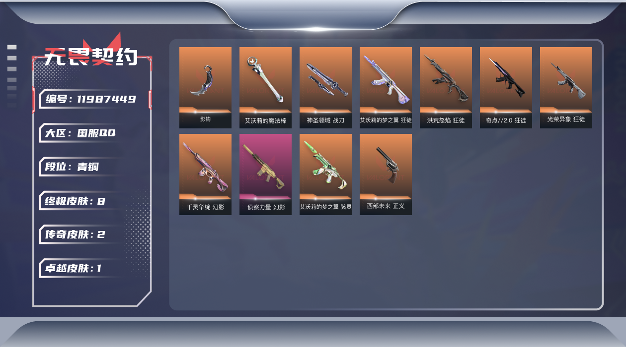 [11987449]【英雄】:幻棱,炼狱,维斯,暮蝶,钛狐,壹决,捷风,幽影,不死鸟,贤者,猎枭,蝰蛇,零,芮娜,奇乐,斯凯,夜露,星礈,K/O,盖可,黑梦 【近战 武器】:近战武器-影钩,近战武器-艾沃莉的魔法棒,近战武器-神圣领域 战刀 【狂徒】:狂徒-艾沃莉的梦之翼,狂徒-洪荒怒焰,狂徒-奇点//2.0,狂徒-光荣异象 【幻影】:幻影-千灵华绽,幻影-侦察力量,幻影-神圣领域 【戍卫】:戍卫-月球哨兵 【獠犬】:獠犬-神圣领域 【冥驹】:冥驹-星云暗涌 【莽侠】:莽侠-月球哨兵 【战神】:战神-神圣领域 【雄鹿】:雄鹿-月球哨兵 【骇灵】:骇灵-艾沃莉的梦之翼,骇灵-星云暗涌 【蜂刺】:蜂刺-星云暗涌 【正义】:正义-西部未来,正义-月球哨兵 【鬼魅】:鬼魅-诡秘蛇影,鬼魅-星云暗涌 【狂怒】:狂怒-神圣领域 【卡面】:精灵大战 卡面,南瓜盛典 卡面,无畏契约GO!第一卷:芮娜 卡面,无畏契约GO!第一卷:零 卡面,代号红色 卡面,新兵报到 卡面,V契约 卡面,无畏契约 卡面 【喷漆】:控场勿近 喷漆,买装还是存钱 喷漆,暴走萝莉 喷漆,放手一搏 喷漆,胜利属于无畏契约 喷漆,GLHF 喷漆,无畏契约 喷漆 【挂饰】:伞绳 挂饰,第九季//第三幕 纪念币 挂饰,无畏契约GO!第一卷 零 挂饰,天外飞客 挂饰,《双城之战》魄罗 挂饰,呼啦熊 挂饰,海豹的认可 挂饰,无畏契约 纪念币 挂饰