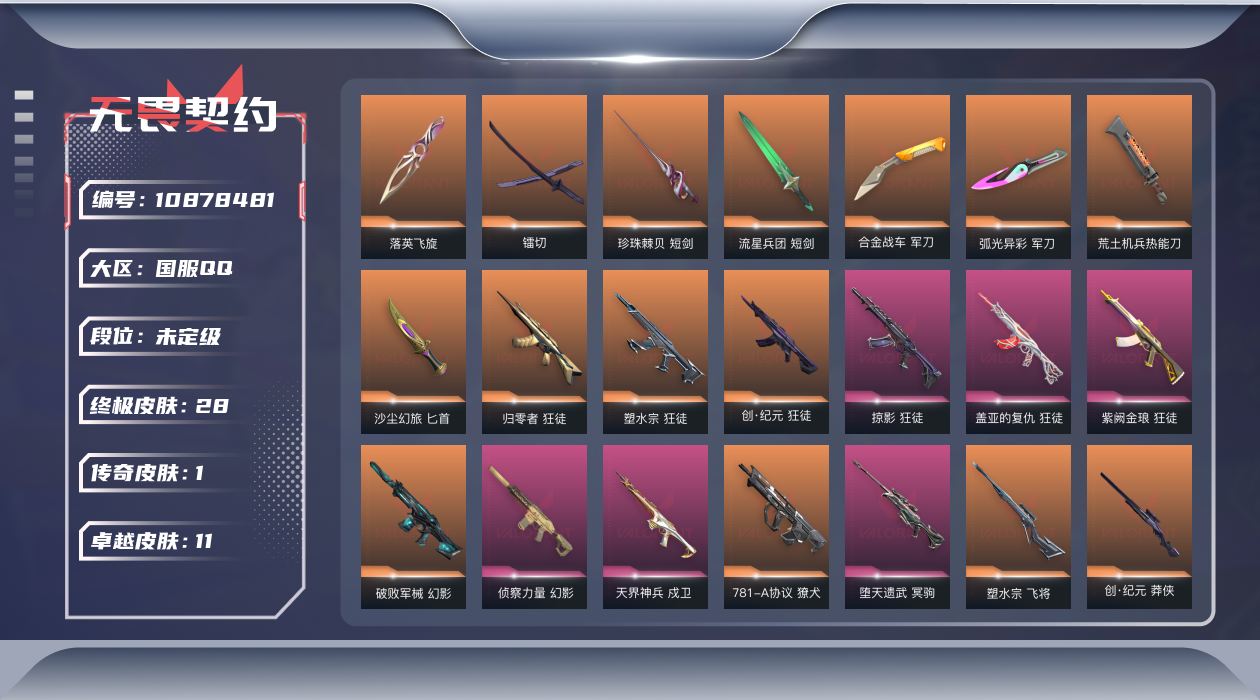 [10878481]【套装】:创·纪元套装,西部未来套装,VCT 2025 赛季套装 【英雄】:幻棱,炼狱,维斯,暮蝶,钛狐,壹决,铁臂,捷风,雷兹,幽影,不死鸟,贤者,猎枭,蝰蛇,零,芮娜,奇乐,尚勃勒,霓虹,斯凯,夜露,星礈,K/O,海神,盖可,黑梦,钢锁 【近战 武器】:近战武器-VCT 2025 爪刀,近战武器-落英飞旋,近战武器-镭切,近战武器-珍珠棘贝 短剑,近战武器-流星兵团 短剑,近战武器-未来开拓者,近战武器-合金战车 军刀,近战武器-弧光异彩 军刀,近战武器-荒土机兵 热能刀,近战武器-沙尘幻旅 匕首,近战武器-诡秘蛇影 军刀,近战武器-神圣领域 战刀 【狂徒】:狂徒-归零者,狂徒-塑水宗,狂徒-创·纪元,狂徒-光荣异象,狂徒-掠影,狂徒-盖亚的复仇,狂徒-紫阙金琅,狂徒-弧光异彩,狂徒-荒土机兵,狂徒-流星兵团,狂徒-沙尘幻旅,狂徒-诡秘蛇影 【幻影】:幻影-破败军械,幻影-西部未来,幻影-侦察力量,幻影-合金战车,幻影-噬源兽防卫工程,幻影-珍珠棘贝,幻影-神圣领域,幻影-纳米打击,幻影-末日之翼,幻影-西部未来 【戍卫】:戍卫-天界神兵,戍卫-珍珠棘贝,戍卫-彩梦之城,戍卫-花漾粉红,戍卫-萌彩剪影,戍卫-逆冲蛮牛,戍卫-战术熊与伙伴们,戍卫-月球哨兵,戍卫-折光棱晶 【獠犬】:獠犬-781-A协议,獠犬-弧光异彩,獠犬-神圣领域,獠犬-复古浪潮,獠犬-胡桃狂想,獠犬-逆冲蛮牛,獠犬-数码咒术 【冥驹】:冥驹-堕天遗武,冥驹-荒土机兵,冥驹-复古浪潮,冥驹-胡桃狂想,冥驹-花漾粉红,冥驹-星云暗涌 【飞将】:飞将-塑水宗,飞将-西部未来,飞将-合金战车,飞将-沙尘幻旅,飞将-信手涂鸦,飞将-战术熊与伙伴们,飞将-末日之翼 【莽侠】:莽侠-创·纪元,莽侠-诡秘蛇影,莽侠-深海水族,莽侠-纤云弄巧,莽侠-月球哨兵 【战神】:战神-离子武器//2.0,战神-神圣领域,战神-萌彩剪影,战神-深海水族,战神-数码咒术 【奥丁】:奥丁-西部未来,奥丁-流星兵团,奥丁-纳米打击,奥丁-信手涂鸦,奥丁-末日之翼 【判官】:判官-诡秘蛇影,判官-萌彩剪影,判官-纳米打击x,判官-数码咒术 【雄鹿】:雄鹿-彩梦之城,雄鹿-复古浪潮,雄鹿-逆冲蛮牛,雄鹿-月球哨兵 【骇灵】:骇灵-创·纪元,骇灵-紫阙金琅,骇灵-荒土机兵,骇灵-流星兵团,骇灵-沙尘幻旅,骇灵-珍珠棘贝,骇灵-花漾