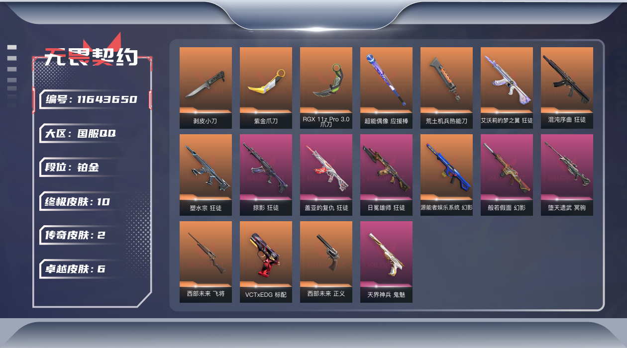 [11643650]【套装】:VCTxEDG 队伍套装 【英雄】:幻棱,炼狱,维斯,暮蝶,钛狐,壹决,铁臂,捷风,雷兹,幽影,不死鸟,贤者,猎枭,蝰蛇,零,芮娜,奇乐,尚勃勒,霓虹,斯凯,夜露,星礈,K/O,海神,盖可,黑梦,钢锁 【近战 武器】:近战武器-剥皮小刀,近战武器-紫金爪刀,近战武器-RGX 11z Pro//3.0 爪刀,近战武器-超能偶像 应援棒,近战武器-荒土机兵 热能刀 【狂徒】:狂徒-艾沃莉的梦之翼,狂徒-混沌序曲,狂徒-塑水宗,狂徒-掠影,狂徒-盖亚的复仇,狂徒-日冕雄师,狂徒-超能偶像,狂徒-荒土机兵 【幻影】:幻影-源能者娱乐系统,幻影-般若假面,幻影-聚合之力,幻影-纳米打击 【戍卫】:戍卫-超能偶像,戍卫-逆冲蛮牛 【獠犬】:獠犬-采蜜小蜂队,獠犬-逆冲蛮牛 【冥驹】:冥驹-堕天遗武,冥驹-荒土机兵 【飞将】:飞将-西部未来,飞将-聚合之力 【战神】:战神-采蜜小蜂队 【奥丁】:奥丁-纳米打击 【判官】:判官-超能偶像,判官-采蜜小蜂队,判官-纳米打击x 【雄鹿】:雄鹿-逆冲蛮牛 【骇灵】:骇灵-荒土机兵 【蜂刺】:蜂刺-聚合之力 【标配】:标配-超能偶像,标配-荒土机兵 【VCT手枪】:标配-VCT x EDG 【正义】:正义-西部未来,正义-超限闪存,正义-复古浪潮,正义-纳米打击 【鬼魅】:鬼魅-天界神兵,鬼魅-流星兵团,鬼魅-采蜜小蜂队,鬼魅-星云暗涌 【狂怒】:狂怒-聚合之力,狂怒-逆冲蛮牛 【卡面】:终章:激斗汉堡 卡面,进入射程 卡面,分崩离析 卡面,纳米打击 卡面,抑制技术 卡面,激斗汉堡 卡面,瓦娃脸雪糕 P2 卡面,从黄昏到黎明 卡面,荒土机兵 卡面,银弹猎手 卡面,逆冲蛮牛 卡面,《双城之战》拥抱 卡面,精灵大战 卡面,欢迎来到底城 卡面,南瓜盛典 卡面,修车达人 卡面,热舞环节 卡面,正义的化身 卡面,终章:生意人麦宝 卡面,铁之华 卡面,失而复得 卡面,时间到 卡面,最高舞台 卡面,复活专家 卡面,归乡 // 蝰蛇 卡面,超能偶像 卡面,生意人麦宝 卡面,声感陷阱设计图 卡面,霓帧牛蛙 卡面,钢锁工牌 卡面,战术小伙伴的夏日 卡面,采蜜小蜂队 卡面,聚合之力 卡面,梦幻奶茶 卡面,终章:打造专属狂徒 卡面,趁热吃 卡面,西装暴徒 卡面,源能反应 卡面,零点嗅探设计图 卡面,终章:瓦娃脸雪糕 卡面,表象之下 卡面,沙雕爆能器 卡