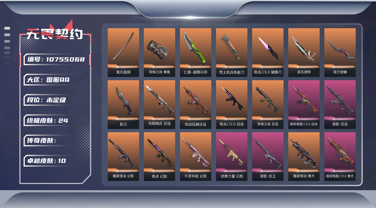[10755068]【套装】:《双城之战》收藏套装,光明哨兵套装,奇点//2.0套装,黯夜怪谈套装,回火礼包:奇点套装,般若假面//2.0套装,掠影套装 【英雄】:炼狱,维斯,暮蝶,壹决,铁臂,捷风,不死鸟,贤者,猎枭,蝰蛇,芮娜,奇乐,尚勃勒,霓虹,盖可,黑梦,钢锁 【近战 武器】:近战武器-鬼丸国纲,近战武器-双城之战 拳套,近战武器-超限闪存 匕首,近战武器-荒土机兵 热能刀,近战武器-奇点//2.0 蝴蝶刀,近战武器-圣石遗物,近战武器-夜刃诡镰,近战武器-影刃 【标配】:标配-黯夜怪谈,标配-荒土机兵,标配-浮光跃金 【狂怒】:狂怒-般若假面//2.0,狂怒-逆冲蛮牛 【鬼魅】:鬼魅-奇点//2.0,鬼魅-天界神兵,鬼魅-模拟赫兹 【正义】:正义-光明哨兵,正义-奇点,正义-掠影,正义-超限闪存,正义-纳米打击 【蜂刺】:蜂刺-超限闪存 【骇灵】:骇灵-奇点,骇灵-荒土机兵,骇灵-浮光跃金 【雄鹿】:雄鹿-模拟赫兹,雄鹿-逆冲蛮牛 【判官】:判官-纳米打击x 【獠犬】:獠犬-黯夜怪谈,獠犬-般若假面//2.0,獠犬-模拟赫兹,獠犬-逆冲蛮牛 【戍卫】:戍卫-掠影,戍卫-浮光跃金,戍卫-逆冲蛮牛 【幻影】:幻影-黯夜怪谈,幻影-奇点,幻影-千灵华绽,幻影-侦察力量,幻影-超限闪存,幻影-纳米打击 【狂徒】:狂徒-光明哨兵,狂徒-机动狂飙,狂徒-奇点//2.0,狂徒-双城之战,狂徒-般若假面//2.0,狂徒-掠影,狂徒-荒土机兵 【飞将】:飞将-黯夜怪谈 【冥驹】:冥驹-光明哨兵,冥驹-掠影,冥驹-荒土机兵,冥驹-模拟赫兹 【莽侠】:莽侠-超限闪存 【战神】:战神-光明哨兵,战神-般若假面//2.0,战神-浮光跃金 【奥丁】:奥丁-纳米打击 【卡面】:终章:激斗汉堡 卡面,进入射程 卡面,分崩离析 卡面,纳米打击 卡面,抑制技术 卡面,激斗汉堡 卡面,瓦娃脸雪糕 P2 卡面,从黄昏到黎明 卡面,荒土机兵 卡面,银弹猎手 卡面,逆冲蛮牛 卡面,《双城之战》拥抱 卡面,精灵大战 卡面,欢迎来到底城 卡面,南瓜盛典 卡面,VCT CN首冠 卡面,唱片的故事 卡面,钢弓与箭弦 卡面,排除故障 卡面,奇点//2.0 卡面,战术桌游 卡面,悠享食光 卡面,修车达人 卡面,热舞环节 卡面,模拟赫兹 卡面,浮光跃金 卡面,超限闪存 卡面,维斯工牌 卡面,正义的化身 卡面,无畏契约GO!第一卷: