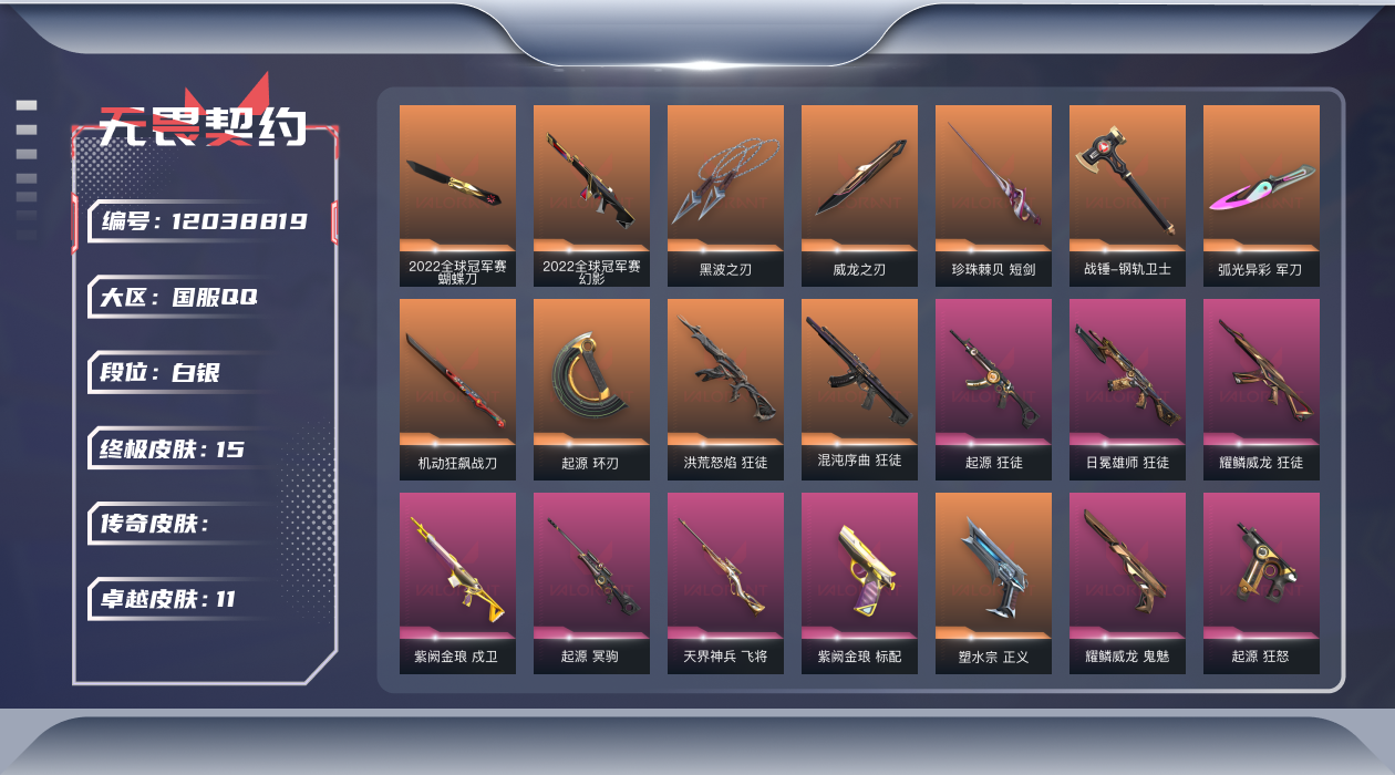 [12038819]皮肤资产43000/【套装】:2022全球冠军赛套装,耀鳞威龙套装,起源套装 【英雄】:幻棱,炼狱,维斯,暮蝶,钛狐,壹决,铁臂,捷风,雷兹,幽影,不死鸟,贤者,猎枭,蝰蛇,零,芮娜,奇乐,尚勃勒,霓虹,斯凯,夜露,星礈,K/O,海神,盖可,黑梦,钢锁【近战 武器】:近战武器-2022全球冠军赛 蝴蝶刀,近战武器-黑波之刃,近战武器-威龙之刃,近战武器-珍珠棘贝 短剑,近战武器-钢轨卫士 战锤,近战武器-弧光异彩 军刀,近战武器-机动狂飙 战刀,近战武器-起源 环刃 【狂徒】:狂徒-洪荒怒焰,狂徒-混沌序曲,狂徒-起源,狂徒-日冕雄师,狂徒-耀鳞威龙,狂徒-钢轨卫士,狂徒-弧光异彩 【幻影】:幻影-2022全球冠军赛,幻影-噬源兽防卫工程,幻影-珍珠棘贝,幻影-战术小伙伴 【戍卫】:戍卫-紫阙金琅,戍卫-钢轨卫士,戍卫-珍珠棘贝,戍卫-彩梦之城,戍卫-萌彩剪影 【獠犬】:獠犬-弧光异彩,獠犬-复古浪潮,獠犬-胡桃狂想,獠犬-战术小伙伴 【冥驹】:冥驹-起源,冥驹-复古浪潮,冥驹-胡桃狂想 【飞将】:飞将-天界神兵,飞将-沙尘幻旅,飞将-信手涂鸦,飞将-光导纤维 【莽侠】:莽侠-深海水族 【战神】:战神-奇点,战神-盖亚的复仇//2.0,战神-萌彩剪影,战神-深海水族 【奥丁】:奥丁-巨神铁甲,奥丁-信手涂鸦,奥丁-战术小伙伴 【判官】:判官-偃月苍龙,判官-萌彩剪影 【雄鹿】:雄鹿-起源,雄鹿-彩梦之城,雄鹿-复古浪潮 【骇灵】:骇灵-沙尘幻旅,骇灵-珍珠棘贝,骇灵-光导纤维,骇灵-信手涂鸦 【蜂刺】:蜂刺-弧光异彩,蜂刺-胡桃狂想,蜂刺-深海水族,蜂刺-战术小伙伴 【标配】:标配-紫阙金琅,标配-浪漫雪国,标配-彩梦之城,标配-光导纤维 【正义】:正义-塑水宗,正义-多边形,正义-复古浪潮,正义-纳米打击 【鬼魅】:鬼魅-耀鳞威龙,鬼魅-光导纤维,鬼魅-胡桃狂想,鬼魅-信手涂鸦 【狂怒】:狂怒-起源,狂怒-钢轨卫士,狂怒-珍珠棘贝,狂怒-萌彩剪影 【短炮】:短炮-钢轨卫士,短炮-弧光异彩,短炮-深海水族 【卡面】:终章:激斗汉堡 卡面,进入射程 卡面,《双城之战》拥抱 卡面,精灵大战 卡面,欢迎来到底城 卡面,南瓜盛典 卡面,超限闪存 卡面,梦幻奶茶 卡面,源能反应 卡面,打造专属狂徒 卡面,零点嗅探设计图 卡面,表象之下 卡面,虹吸式咖啡壶 卡面,源能者美容