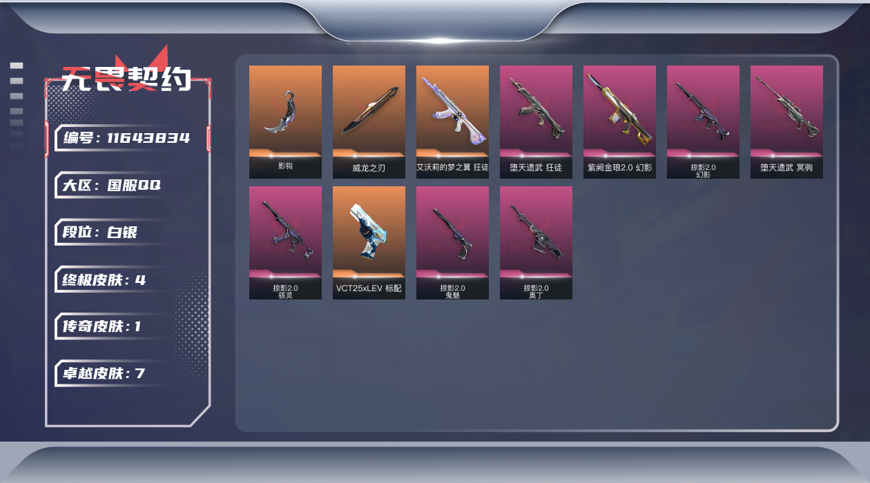 [11643834]【套装】:掠影//2.0套装 【英雄】:炼狱,捷风,幽影,不死鸟,贤者,猎枭,蝰蛇,芮娜,霓虹,斯凯 【近战 武器】:近战武器-影钩,近战武器-威龙之刃 【狂徒】:狂徒-艾沃莉的梦之翼,狂徒-堕天遗武 【幻影】:幻影-紫阙金琅//2.0,幻影-掠影//2.0 【冥驹】:冥驹-堕天遗武 【奥丁】:奥丁-掠影//2.0 【骇灵】:骇灵-掠影//2.0 【VCT手枪】:标配-VCT25 x LEV 【鬼魅】:鬼魅-掠影//2.0 【卡面】:Clutch 卡面,无畏契约GO!第一卷:芮娜 卡面,无畏契约GO!第一卷:零 卡面,《双城之战》金克丝 卡面,代号红色 卡面,新兵报到 卡面,V契约 卡面,无畏契约 卡面 【喷漆】:买装还是存钱 喷漆,胜利属于无畏契约 喷漆,GLHF 喷漆,无畏契约 喷漆 【挂饰】:鱼骨头 挂饰,天外飞客 挂饰,红鳞松叶 挂饰,《双城之战》魄罗 挂饰,无畏契约 纪念币 挂饰