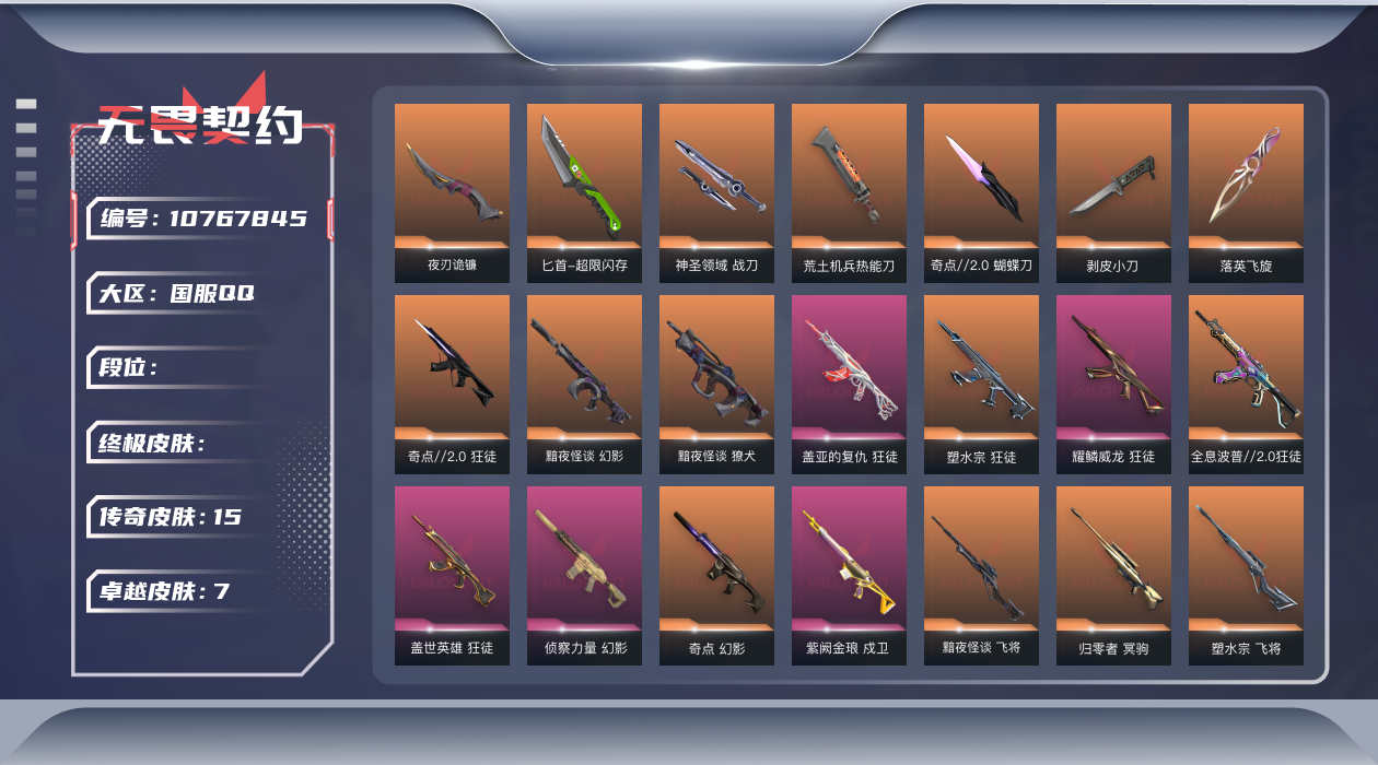 [10767845]Lv132 ,皮肤总价值43910,白银III,总皮肤79,刀皮8枪皮71(传奇13卓越8),套装2(传奇2),奇点2.0套装,黯夜怪谈套装 【区服】QQ 【游戏等级】Lv132 【游戏段位】白银III 【剩余V点】121 【剩余R点】20 【皮肤资产价值】43910 【使用R点】980 【英雄数量】27 【皮肤数量】79 【卡面数量】100 【喷漆数量】89 【挂件数量】69 【拥有套装】黯夜怪谈套装(黯夜怪谈-幻影,黯夜怪谈-獠犬,黯夜怪谈-飞将,黯夜怪谈-标配,夜刃诡镰)奇点2.0套装(奇点//2.0-狂徒,奇点//2.0-鬼魅,奇点//2.0-蝴蝶刀) 【拥有近战武器】诡秘蛇影-军刀,神圣领域-战刀,荒土机兵-热能刀,超限闪存-匕首,落英飞旋,剥皮小刀, 【拥有步枪】塑水宗-狂徒,全息波普//2.0-狂徒,奇点-幻影,盖世英雄-狂徒,紫阙金琅-戍卫,盖亚的复仇-狂徒,侦察力量-幻影,耀鳞威龙-狂徒-,诡秘蛇影-狂徒,神圣领域-獠犬,神圣领域-幻影,荒土机兵-狂徒,超限闪存-幻影,末日之翼-幻影,折光棱晶-戍卫,月球哨兵-戍卫,纳米打击-幻影,逆冲蛮牛-戍卫,逆冲蛮牛-獠犬,模拟赫兹-獠犬,浮光跃金-戍卫, 【拥有狙击枪】塑水宗-飞将,归零者-冥驹,诡秘蛇影-莽侠,荒土机兵-冥驹,超限闪存-莽侠,末日之翼-飞将,星云暗涌-冥驹,月球哨兵-莽侠,模拟赫兹-冥驹, 【拥有机枪】神圣领域-战神,末日之翼-奥丁,纳米打击-奥丁,浮光跃金-战神, 【拥有冲锋枪】奇点-骇灵,荒土机兵-骇灵,超限闪存-蜂刺,折光棱晶-蜂刺,星云暗涌-蜂刺,星云暗涌-骇灵,浮光跃金-骇灵, 【拥有霰弹枪】天界神兵//2.0-判官,起源-雄鹿,诡秘蛇影-判官,月球哨兵-雄鹿,逆冲蛮牛-雄鹿,纳米打击-判官,模拟赫兹-雄鹿, 【拥有手枪】奇点-正义,天界神兵-鬼魅,阿特拉斯指挥部-标配,诡秘蛇影-鬼魅,神圣领域-狂怒,荒土机兵-标配,超限闪存-正义,超能偶像-标配,流星兵团-鬼魅,折光棱晶-标配,末日之翼-短炮,星云暗涌-鬼魅,月球哨兵-正义,纳米打击-正义,逆冲蛮牛-狂怒,浮光跃金-标配,模拟赫兹-鬼魅, 【稀有挂件】V25第三幕黄金挂饰,第九季黄金挂饰,终章猫猫木乃伊挂饰,猫猫木乃伊挂饰,无畏契约GO第一卷芮娜挂饰,无畏契约GO第一卷零挂饰,拳击战术熊挂饰,熔岩灯挂饰,袖珍捷风挂饰,糖葫芦