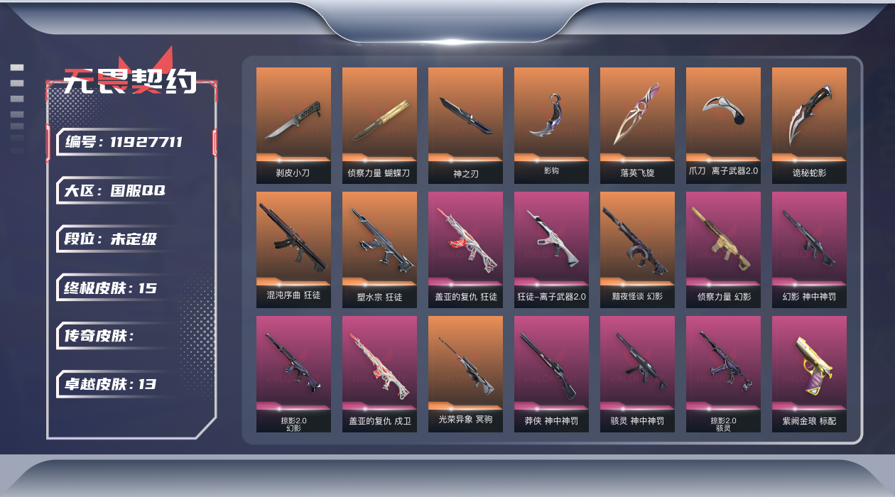 [11927711]【套装】:神中神罚套装,掠影//2.0套装 【英雄】:幻棱,炼狱,维斯,暮蝶,壹决,铁臂,捷风,雷兹,幽影,不死鸟,贤者,猎枭,蝰蛇,零,芮娜,奇乐,尚勃勒,霓虹,斯凯,夜露,K/O,盖可,黑梦,钢锁 【近战 武器】:近战武器-剥皮小刀,近战武器-侦察力量 蝴蝶刀,近战武器-神之刃,近战武器-影钩,近战武器-落英飞旋,近战武器-离子武器//2.0 爪刀,近战武器-诡秘蛇影 军刀 【狂徒】:狂徒-混沌序曲,狂徒-塑水宗,狂徒-盖亚的复仇,狂徒-离子武器//2.0,狂徒-诡秘蛇影 【幻影】:幻影-黯夜怪谈,幻影-侦察力量,幻影-神中神罚,幻影-掠影//2.0,幻影-末日之翼 【戍卫】:戍卫-盖亚的复仇,戍卫-折光棱晶 【冥驹】:冥驹-光荣异象 【飞将】:飞将-末日之翼 【莽侠】:莽侠-神中神罚,莽侠-诡秘蛇影 【奥丁】:奥丁-掠影//2.0,奥丁-末日之翼 【判官】:判官-诡秘蛇影 【骇灵】:骇灵-神中神罚,骇灵-掠影//2.0 【蜂刺】:蜂刺-折光棱晶 【标配】:标配-紫阙金琅,标配-折光棱晶 【正义】:正义-塑水宗 【鬼魅】:鬼魅-噬影者,鬼魅-掠影//2.0,鬼魅-诡秘蛇影 【狂怒】:狂怒-神中神罚 【短炮】:短炮-末日之翼 【卡面】:无畏契约:暮蝶 卡面,树懒大作战 卡面,Clutch 卡面,无畏契约GO!第一卷:芮娜 卡面,无畏契约GO!第一卷:零 卡面,无垠星环 卡面,《双城之战》金克丝 卡面,无畏契约GO!第一卷:贤者 卡面,钢锁vs盖可 卡面,代号红色 卡面,新兵报到 卡面,V契约 卡面,无畏契约 卡面 【喷漆】:伤心心 喷漆,买装还是存钱 喷漆,无畏契约GO!第一卷:芮娜 喷漆,无畏契约GO!第一卷:零 喷漆,无畏契约GO!第一卷:贤者 喷漆,松叶 喷漆,放下武器 喷漆,胜利属于无畏契约 喷漆,GLHF 喷漆,无畏契约 喷漆 【挂饰】:无畏契约GO!第一卷 芮娜 挂饰,薰衣草之心 挂饰,动力机箱 挂饰,天外飞客 挂饰,红鳞松叶 挂饰,《双城之战》魄罗 挂饰,无畏契约 纪念币 挂饰