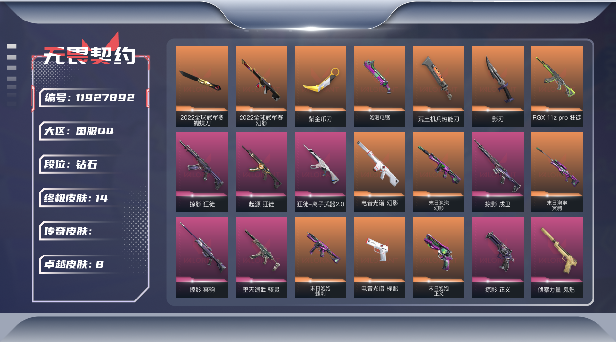 [11927892]【套装】:2022全球冠军赛套装,末日泡泡套装,掠影套装 【英雄】:幻棱,炼狱,维斯,暮蝶,壹决,铁臂,捷风,雷兹,幽影,不死鸟,贤者,猎枭,蝰蛇,零,芮娜,奇乐,尚勃勒,霓虹,夜露,K/O,盖可,黑梦,钢锁 【近战 武器】:近战武器-2022全球冠军赛 蝴蝶刀,近战武器-紫金爪刀,近战武器-泡泡电锯,近战武器-荒土机兵 热能刀,近战武器-影刃 【狂徒】:狂徒-RGX 11z Pro,狂徒-掠影,狂徒-起源,狂徒-离子武器//2.0,狂徒-荒土机兵 【幻影】:幻影-2022全球冠军赛,幻影-电音光谱,幻影-末日泡泡,幻影-纳米打击,幻影-电音光谱 【戍卫】:戍卫-掠影,戍卫-逆冲蛮牛 【獠犬】:獠犬-逆冲蛮牛 【冥驹】:冥驹-末日泡泡,冥驹-掠影,冥驹-荒土机兵 【奥丁】:奥丁-纳米打击 【判官】:判官-纳米打击x 【雄鹿】:雄鹿-逆冲蛮牛 【骇灵】:骇灵-堕天遗武,骇灵-荒土机兵 【蜂刺】:蜂刺-末日泡泡 【标配】:标配-电音光谱,标配-荒土机兵,标配-电音光谱 【正义】:正义-末日泡泡,正义-掠影,正义-超限闪存,正义-纳米打击 【鬼魅】:鬼魅-侦察力量,鬼魅-诡秘蛇影,鬼魅-扑棱扑棱,鬼魅-星云暗涌 【狂怒】:狂怒-逆冲蛮牛 【短炮】:短炮-弧光异彩 【卡面】:终章:激斗汉堡 卡面,进入射程 卡面,分崩离析 卡面,纳米打击 卡面,抑制技术 卡面,激斗汉堡 卡面,瓦娃脸雪糕 P2 卡面,从黄昏到黎明 卡面,荒土机兵 卡面,银弹猎手 卡面,逆冲蛮牛 卡面,《双城之战》拥抱 卡面,精灵大战 卡面,欢迎来到底城 卡面,南瓜盛典 卡面,无畏契约:暮蝶 卡面,修车达人 卡面,正义的化身 卡面,零点嗅探设计图 卡面,瓦娃脸雪糕 卡面 ,无畏契约GO!第一卷:芮娜 卡面,清除名单 卡面,无畏契约GO!第一卷:零 卡面,《双城之战》金克丝 卡面,夯实根基 卡面,"Luie" 卡面,热烈欢迎 卡面,铁臂设计图 卡面,代号红色 卡面,冰淇淋店 卡面,新兵报到 卡面,友军火力 卡面,V契约 卡面,无畏契约 卡面 【喷漆】:小小心意 喷漆,战“素”兔 喷漆,宇宙的指引 喷漆,请求重启 喷漆,逆冲蛮牛 喷漆,纳米打击 喷漆,鼻尖上的蝴蝶 喷漆,简笔画黯兽 喷漆,独守蝰腹 喷漆,他们将落荒而逃 喷漆,通缉:战术企鹅 喷漆,荒土机兵 喷漆,别挡我吃球! 喷漆,嗨宝南瓜灯 喷漆,嘭! 喷漆,