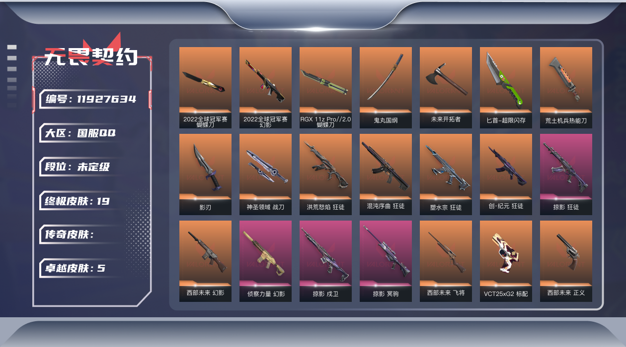 [11927634]【套装】:2022全球冠军赛套装,西部未来套装,掠影套装 【英雄】:幻棱,炼狱,维斯,暮蝶,钛狐,壹决,铁臂,捷风,雷兹,幽影,不死鸟,贤者,猎枭,蝰蛇,零,芮娜,奇乐,尚勃勒,霓虹,斯凯,夜露,星礈,K/O,海神,盖可,黑梦,钢锁 【近战 武器】:近战武器-2022全球冠军赛 蝴蝶刀,近战武器-RGX 11z Pro//2.0 蝴蝶刀,近战武器-鬼丸国纲,近战武器-未来开拓者,近战武器-超限闪存 匕首,近战武器-荒土机兵 热能刀,近战武器-影刃,近战武器-神圣领域 战刀 【狂徒】:狂徒-洪荒怒焰,狂徒-混沌序曲,狂徒-塑水宗,狂徒-创·纪元,狂徒-掠影,狂徒-荒土机兵 【幻影】:幻影-2022全球冠军赛,幻影-西部未来,幻影-侦察力量,幻影-超限闪存,幻影-神圣领域,幻影-纳米打击,幻影-西部未来 【戍卫】:戍卫-掠影,戍卫-浮光跃金,戍卫-逆冲蛮牛,戍卫-月球哨兵 【獠犬】:獠犬-神圣领域,獠犬-模拟赫兹,獠犬-逆冲蛮牛 【冥驹】:冥驹-掠影,冥驹-荒土机兵,冥驹-模拟赫兹,冥驹-星云暗涌 【飞将】:飞将-西部未来 【莽侠】:莽侠-超限闪存,莽侠-月球哨兵 【战神】:战神-神圣领域,战神-浮光跃金 【奥丁】:奥丁-西部未来,奥丁-纳米打击 【判官】:判官-纳米打击x 【雄鹿】:雄鹿-模拟赫兹,雄鹿-逆冲蛮牛,雄鹿-月球哨兵 【骇灵】:骇灵-荒土机兵,骇灵-浮光跃金,骇灵-星云暗涌 【蜂刺】:蜂刺-超限闪存,蜂刺-星云暗涌 【标配】:标配-荒土机兵,标配-浮光跃金 【VCT手枪】:标配-VCT25 x G2 【正义】:正义-西部未来,正义-掠影,正义-超限闪存,正义-纳米打击,正义-月球哨兵 【鬼魅】:鬼魅-诡秘蛇影,鬼魅-模拟赫兹,鬼魅-星云暗涌 【狂怒】:狂怒-神圣领域,狂怒-逆冲蛮牛 【卡面】:终章:激斗汉堡 卡面,进入射程 卡面,分崩离析 卡面,纳米打击 卡面,抑制技术 卡面,激斗汉堡 卡面,瓦娃脸雪糕 P2 卡面,从黄昏到黎明 卡面,荒土机兵 卡面,银弹猎手 卡面,逆冲蛮牛 卡面,《双城之战》拥抱 卡面,精灵大战 卡面,欢迎来到底城 卡面,南瓜盛典 卡面,唱片的故事 卡面,钢弓与箭弦 卡面,排除故障 卡面,战术桌游 卡面,悠享食光 卡面,修车达人 卡面,模拟赫兹 卡面,浮光跃金 卡面,超限闪存 卡面,维斯工牌 卡面,正义的化身 卡面,梦幻奶茶 卡面,西