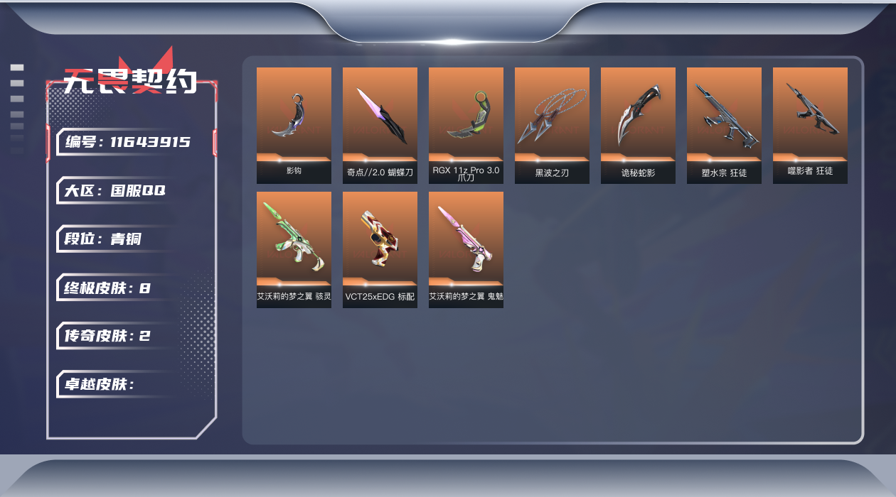 [11643915]【英雄】:幻棱,炼狱,暮蝶,钛狐,壹决,捷风,幽影,不死鸟,贤者,猎枭,零,芮娜,霓虹,夜露 【近战 武器】:近战武器-影钩,近战武器-奇点//2.0 蝴蝶刀,近战武器-RGX 11z Pro//3.0 爪刀,近战武器-黑波之刃,近战武器-诡秘蛇影 军刀 【狂徒】:狂徒-塑水宗,狂徒-噬影者,狂徒-诡秘蛇影 【幻影】:幻影-末日之翼 【戍卫】:戍卫-折光棱晶 【飞将】:飞将-末日之翼 【莽侠】:莽侠-诡秘蛇影 【奥丁】:奥丁-末日之翼 【判官】:判官-诡秘蛇影 【骇灵】:骇灵-艾沃莉的梦之翼 【蜂刺】:蜂刺-折光棱晶 【标配】:标配-折光棱晶 【VCT手枪】:标配-VCT25 x EDG 【鬼魅】:鬼魅-艾沃莉的梦之翼,鬼魅-诡秘蛇影 【短炮】:短炮-末日之翼 【卡面】:《双城之战》金克丝 卡面,代号红色 卡面,新兵报到 卡面,V契约 卡面,无畏契约 卡面 【喷漆】:蛋糕还是爆能器? 喷漆,暴走萝莉 喷漆,胜利属于无畏契约 喷漆,GLHF 喷漆,无畏契约 喷漆 【挂饰】:VCT x EDG 挂饰,无畏契约 纪念币 挂饰