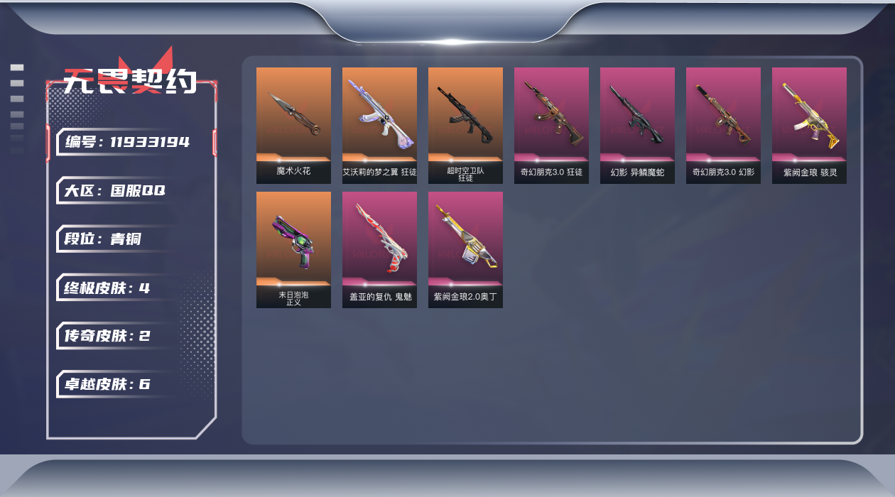 [11933194]【英雄】:炼狱,钛狐,壹决,铁臂,捷风,不死鸟,贤者,猎枭,蝰蛇,零,尚勃勒,霓虹,斯凯,K/O,盖可,黑梦 【近战 武器】:近战武器-魔术火花,近战武器-魔术火花 【狂徒】:狂徒-艾沃莉的梦之翼,狂徒-超时空卫队,狂徒-2025全球冠军赛,狂徒-奇幻朋克//3.0 【幻影】:幻影-异鳞魔蛇,幻影-奇幻朋克//3.0 【奥丁】:奥丁-紫阙金琅//2.0 【骇灵】:骇灵-紫阙金琅 【正义】:正义-末日泡泡 【鬼魅】:鬼魅-盖亚的复仇 【卡面】:无畏契约GO!第一卷:芮娜 卡面,无畏契约GO!第一卷:零 卡面,《双城之战》金克丝 卡面,钢锁vs盖可 卡面,别冒尖 卡面,代号红色 卡面,新兵报到 卡面,V契约 卡面,无畏契约 卡面 【喷漆】:霓光四射 喷漆,买装还是存钱 喷漆,关门放狗 喷漆,胜利属于无畏契约 喷漆,GLHF 喷漆,无畏契约 喷漆 【挂饰】:无畏契约GO!第一卷 零 挂饰,天外飞客 挂饰,《双城之战》魄罗 挂饰,无畏契约 纪念币 挂饰