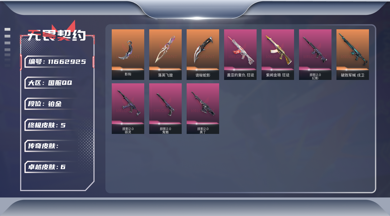 [11662925]【套装】:掠影//2.0套装 【英雄】:幻棱,炼狱,维斯,暮蝶,钛狐,壹决,铁臂,捷风,不死鸟,贤者,猎枭,芮娜,奇乐,尚勃勒,K/O,黑梦 【近战 武器】:近战武器-影钩,近战武器-落英飞旋,近战武器-诡秘蛇影 军刀 【狂徒】:狂徒-盖亚的复仇,狂徒-紫阙金琅,狂徒-诡秘蛇影 【幻影】:幻影-掠影//2.0,幻影-末日之翼 【戍卫】:戍卫-破败军械,戍卫-折光棱晶 【飞将】:飞将-末日之翼 【莽侠】:莽侠-诡秘蛇影 【奥丁】:奥丁-掠影//2.0,奥丁-末日之翼 【判官】:判官-诡秘蛇影 【骇灵】:骇灵-掠影//2.0 【蜂刺】:蜂刺-折光棱晶 【标配】:标配-折光棱晶 【鬼魅】:鬼魅-掠影//2.0,鬼魅-诡秘蛇影 【短炮】:短炮-末日之翼 【卡面】:无畏契约:暮蝶 卡面,树懒大作战 卡面,红鳞松叶 卡面,Clutch 卡面,源能反应 卡面,无畏契约GO!第一卷:芮娜 卡面,无畏契约GO!第一卷:零 卡面,无畏契约GO!第一卷:贤者 卡面,钢锁vs盖可 卡面,代号红色 卡面,新兵报到 卡面,V契约 卡面,无畏契约 卡面 【喷漆】:伤心心 喷漆,审判之爪 喷漆,双击点赞 喷漆,买装还是存钱 喷漆,酷熊冲浪 喷漆,无畏契约GO!第一卷:芮娜 喷漆,松叶 喷漆,又一个梦幻组合 喷漆,胜利属于无畏契约 喷漆,GLHF 喷漆,无畏契约 喷漆 【挂饰】:薰衣草之心 挂饰,天外飞客 挂饰,红鳞松叶 挂饰,《双城之战》魄罗 挂饰,无畏契约 纪念币 挂饰